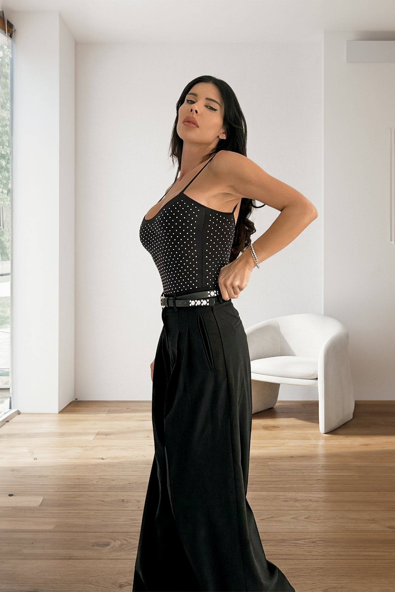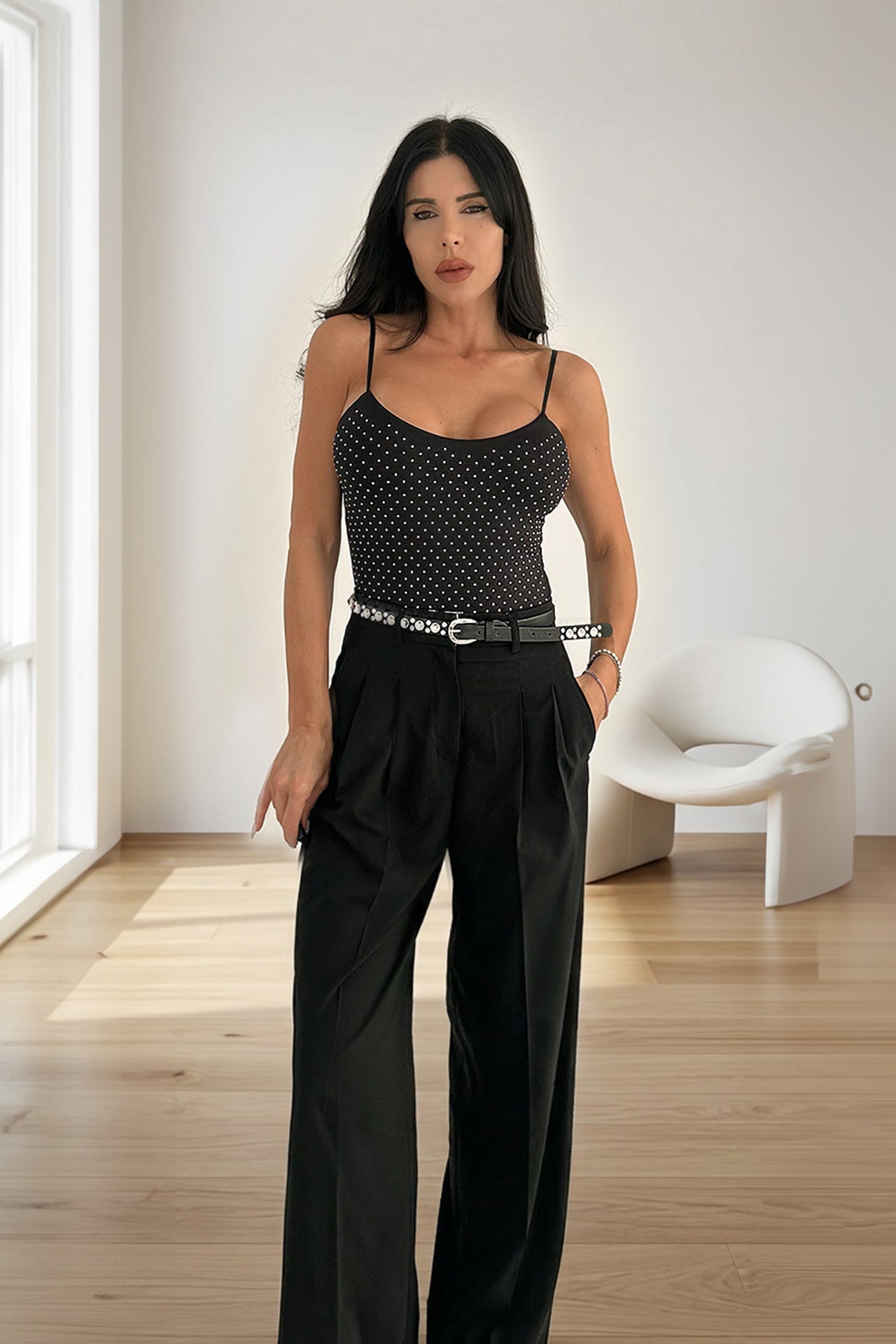 Елегантно боди от еластична ликра, което подчертава силуета и осигурява комфорт през целия ден. Моделът е с тънки презрамки и прилепнала кройка, която оформя фигурата. Дизайнът е акцентиран с фини декоративни камъни, които придават деликатен блясък и стилен завършек. Подходящо е както за елегантни вечерни визии, така и за модерни ежедневни комбинации.