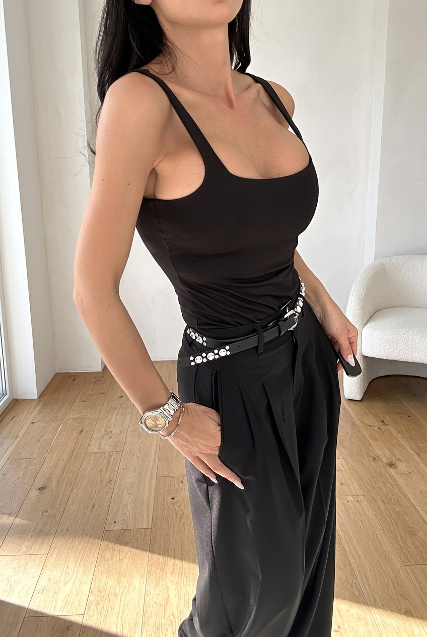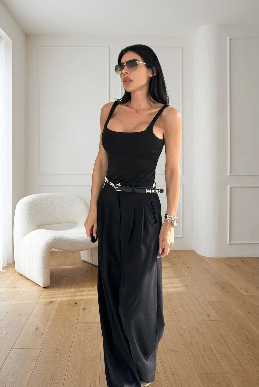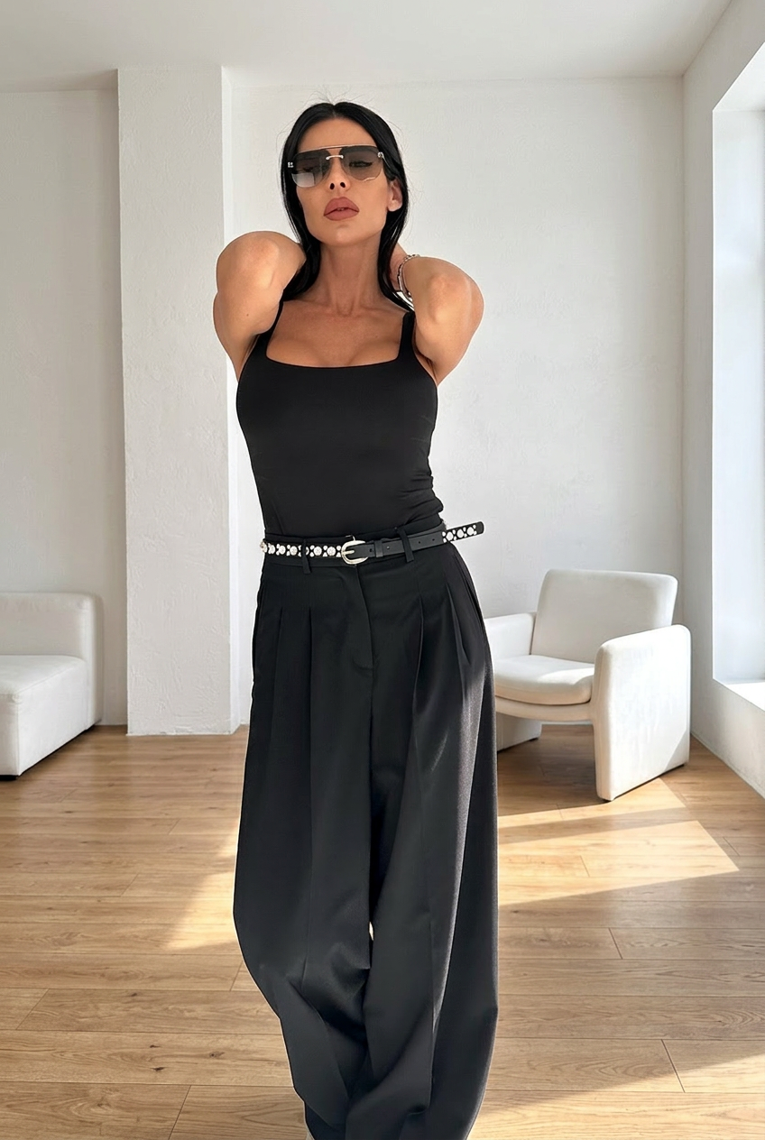 Елегантно боди от меко и еластично трико, което прилепва перфектно по тялото и подчертава силуета. Моделът е с изчистен дизайн, широки презрамки и право деколте, което придава модерен и стилен вид. Благодарение на комфортната материя и минималистичната линия, бодито е идеално както за елегантни визии, така и за ежедневни комбинации с панталони, поли или дънки.