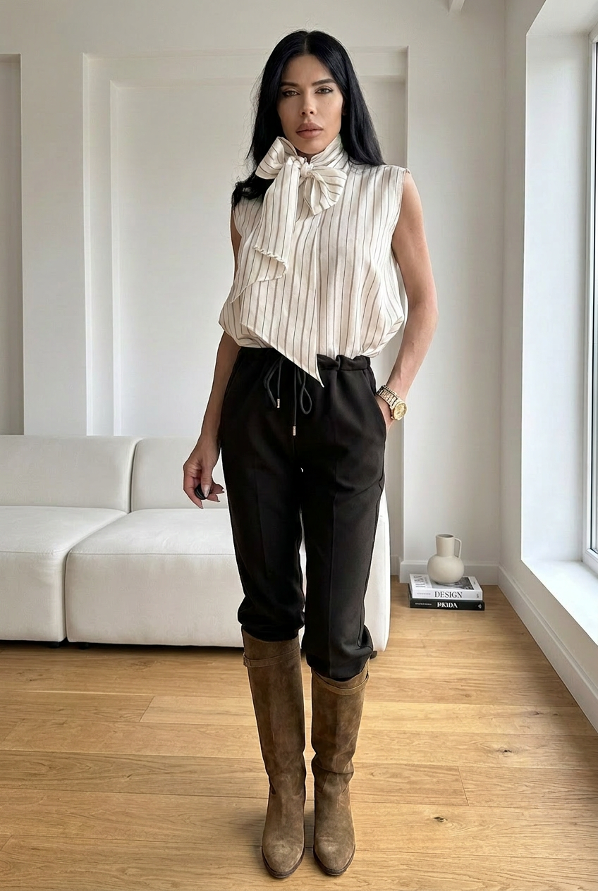 Елегантен панталон от креп материя с изчистена и модерна линия. Моделът е с леко стеснена кройка, която оформя силуета, и удобна еластична талия с връзки за допълнителен комфорт. Панталонът е с практични странични джобове и гладка, фино падаща материя, която придава стилен и подреден вид. Подходящ е както за ежедневни визии, така и за по-елегантни комбинации.