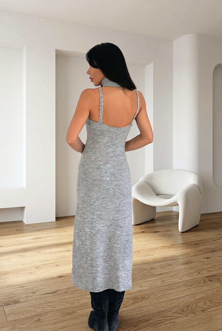 Елегантна рокля от фино мохерно трико, която нежно следва линиите на тялото и създава изтънчен силует. Моделът е с издължена дължина, без ръкави и с висока поло яка, която придава стилна и модерна визия. Меката и лека материя осигурява комфорт и топлина, което прави роклята идеален избор както за ежедневни, така и за по-елегантни поводи през по-хладните дни.