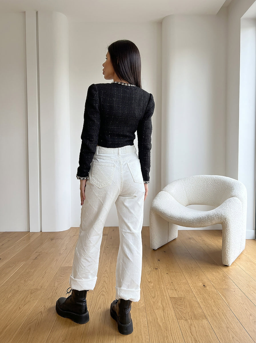 Стилни дънки с висока талия и модерна права кройка, изработени от плътен деним с ефектна накъсана текстура във формата на ромбоиди. Дизайнът съчетава класическа линия с интересен релефен десен, който придава характер и отличава модела. Дънките са с практични джобове и закопчаване с цип и копче, а леко свободната кройка осигурява комфорт и стилна визия. Подходящи са както за ежедневни комбинации, така и за по-елегантни аутфити.