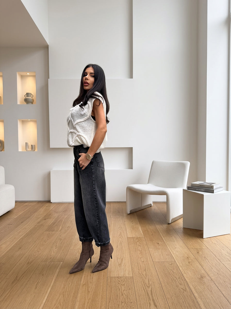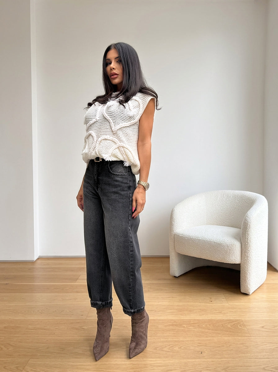 Стилни дънки с изчистена линия, изработени от висококачествен памучен деним. Към модела има включен колан от кожа. Моделът е с висока талия и леко свободна кройка, която осигурява комфорт и естествено падащ силует. Класическият дизайн ги прави универсални и лесни за комбиниране както с елегантни ризи, така и с по-ежедневни топове.