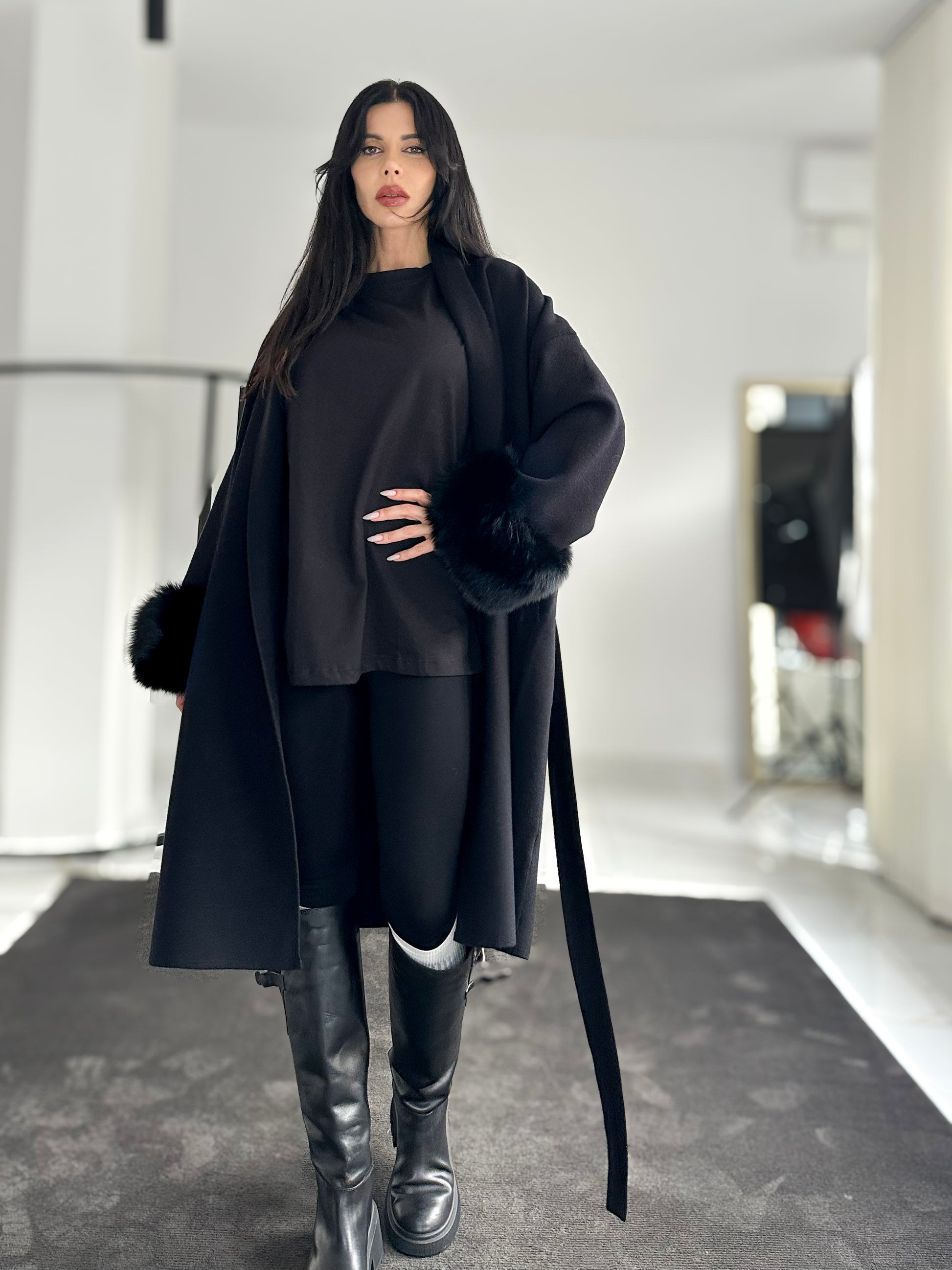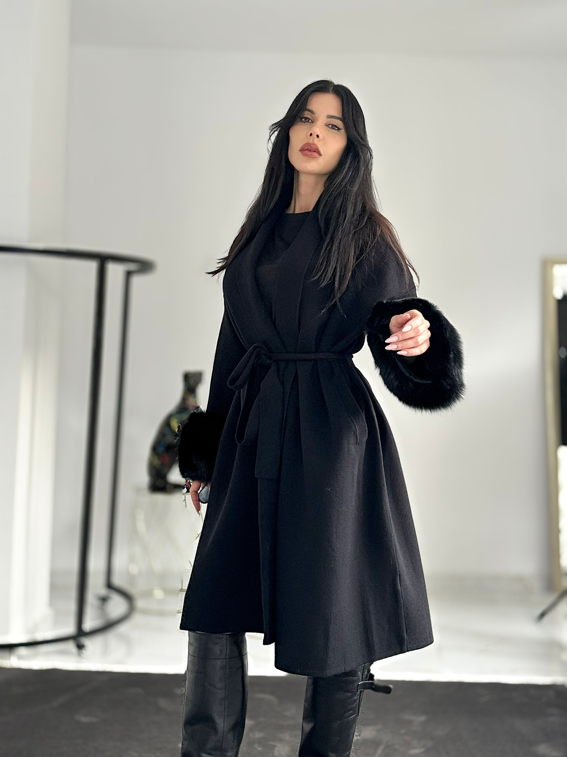 🖤 Детайли: Ръкавите са украсени с пищни маншети от еко косъм, които придават модерен акцент и обем. Коланът е от същия плат и може да се връзва свободно, за по-лежерна визия, или плътно — за структурирана форма.