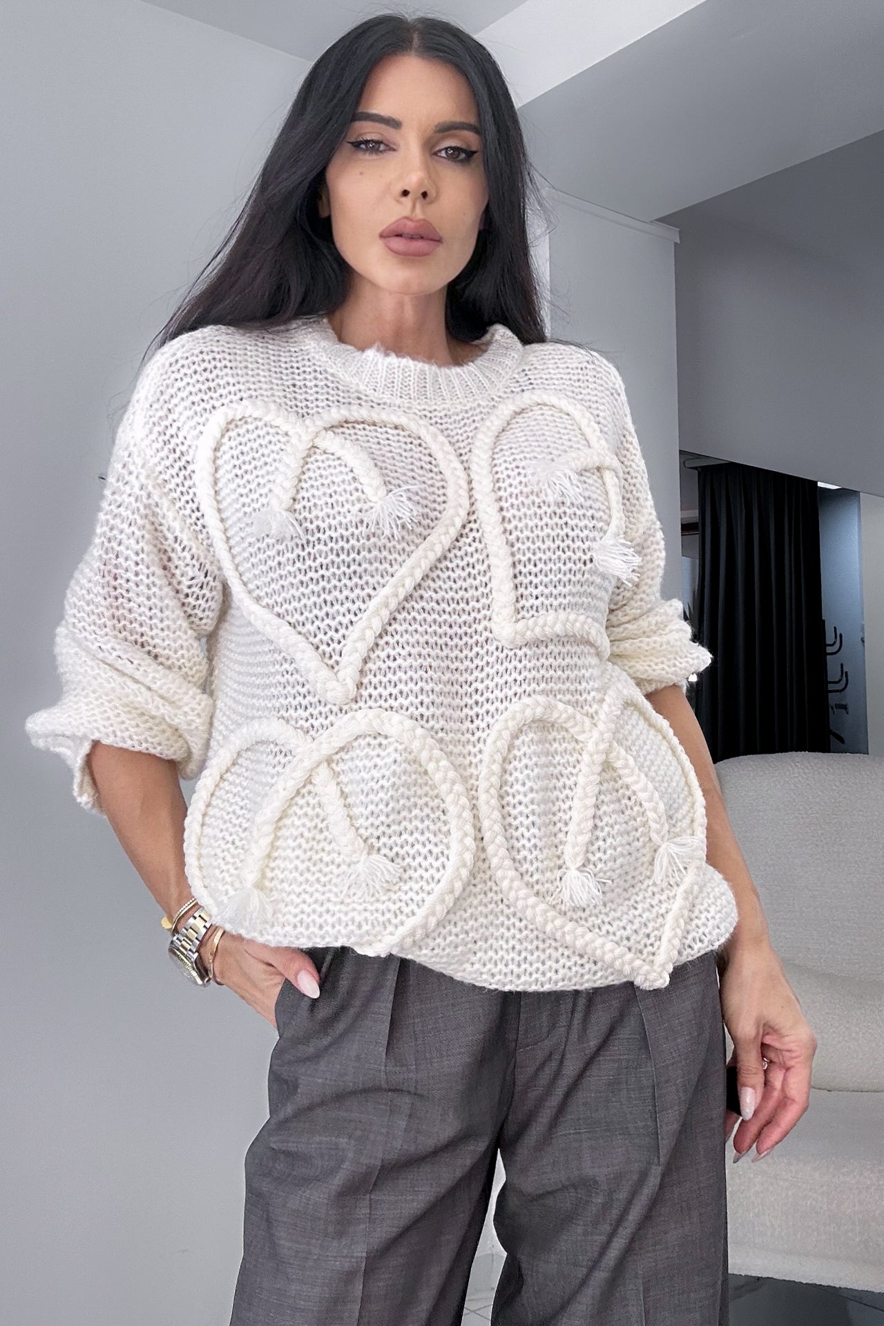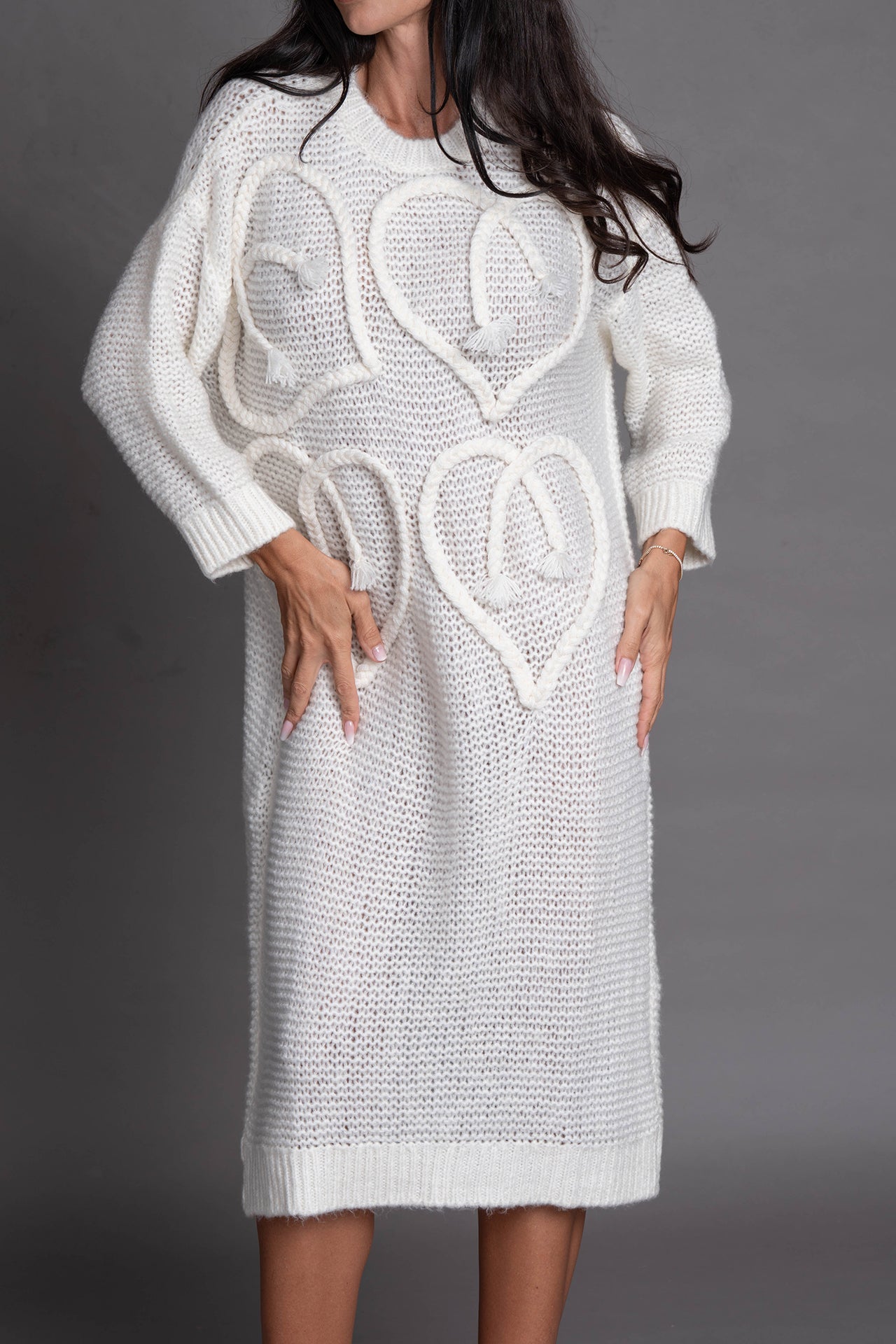 Мек и уютен пуловер в макси дължина в нежен млечно-бял цвят, изработен от плетена материя с едра текстура. Моделът впечатлява с ръчно изработени релефни сърца отпред — детайл, който придава артистичен и романтичен характер. Свободната кройка и спуснатите рамене осигуряват комфорт и модерен, непринуден силует. Идеален за есенно-зимния сезон, съчетава се прекрасно както с класически панталон, така и с дънки.