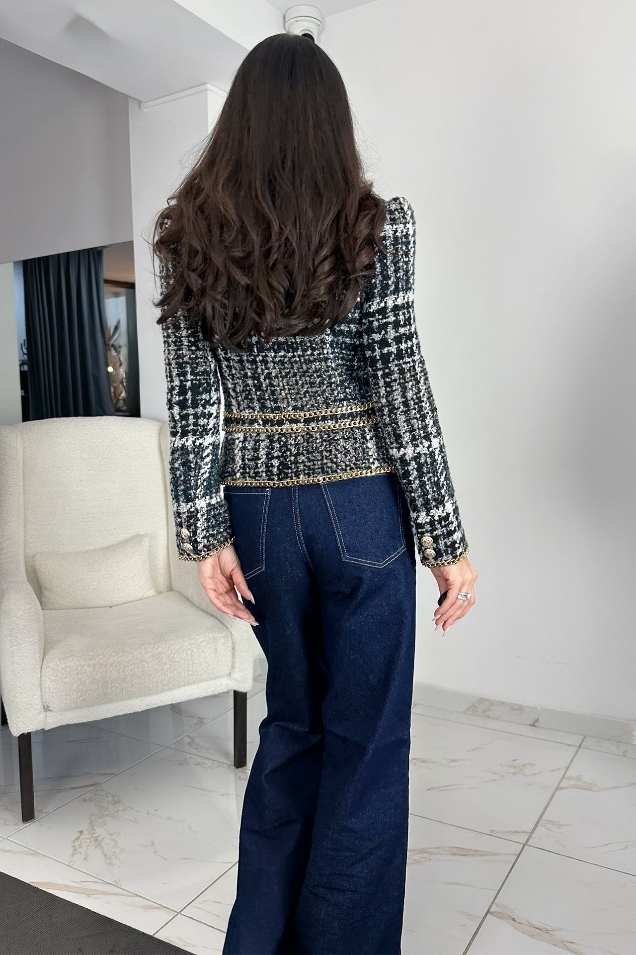 Елегантно вталено сако, изработено от класически туид в черно-бяла гама. Моделът впечатлява с изискани златни детайли — декоративни копчета и фини верижки по кантовете, които му придават усещане за лукс и парижки шик. Структурираната кройка подчертава талията и създава изтънчена визия, подходяща както за делови стил, така и за вечерни събития.