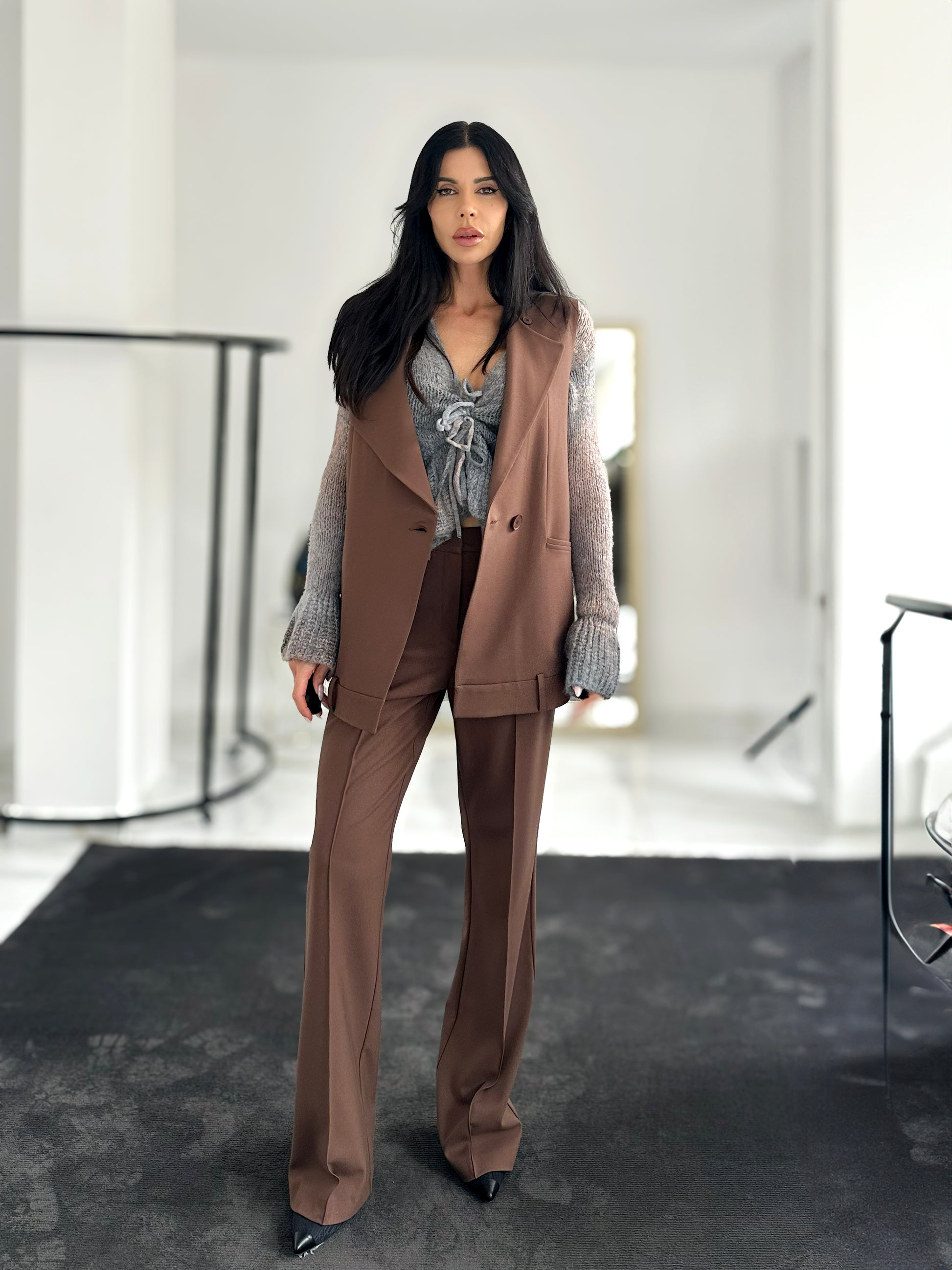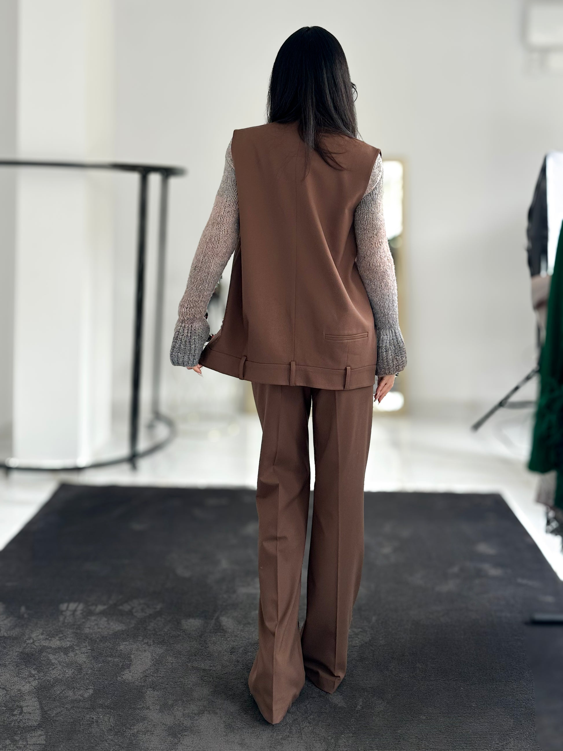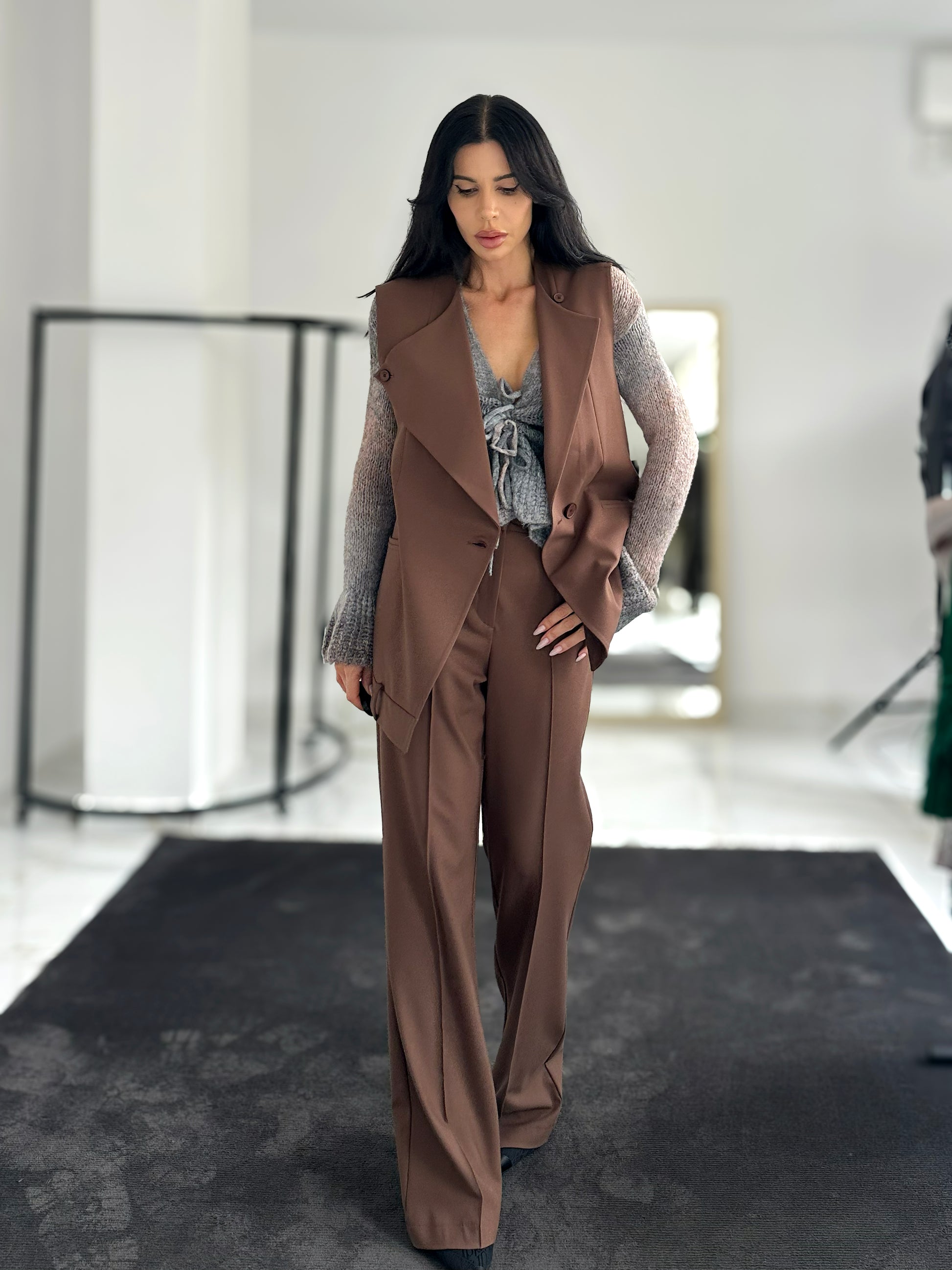 📏 Кройка: удължен елек, прав панталон с висока талия
