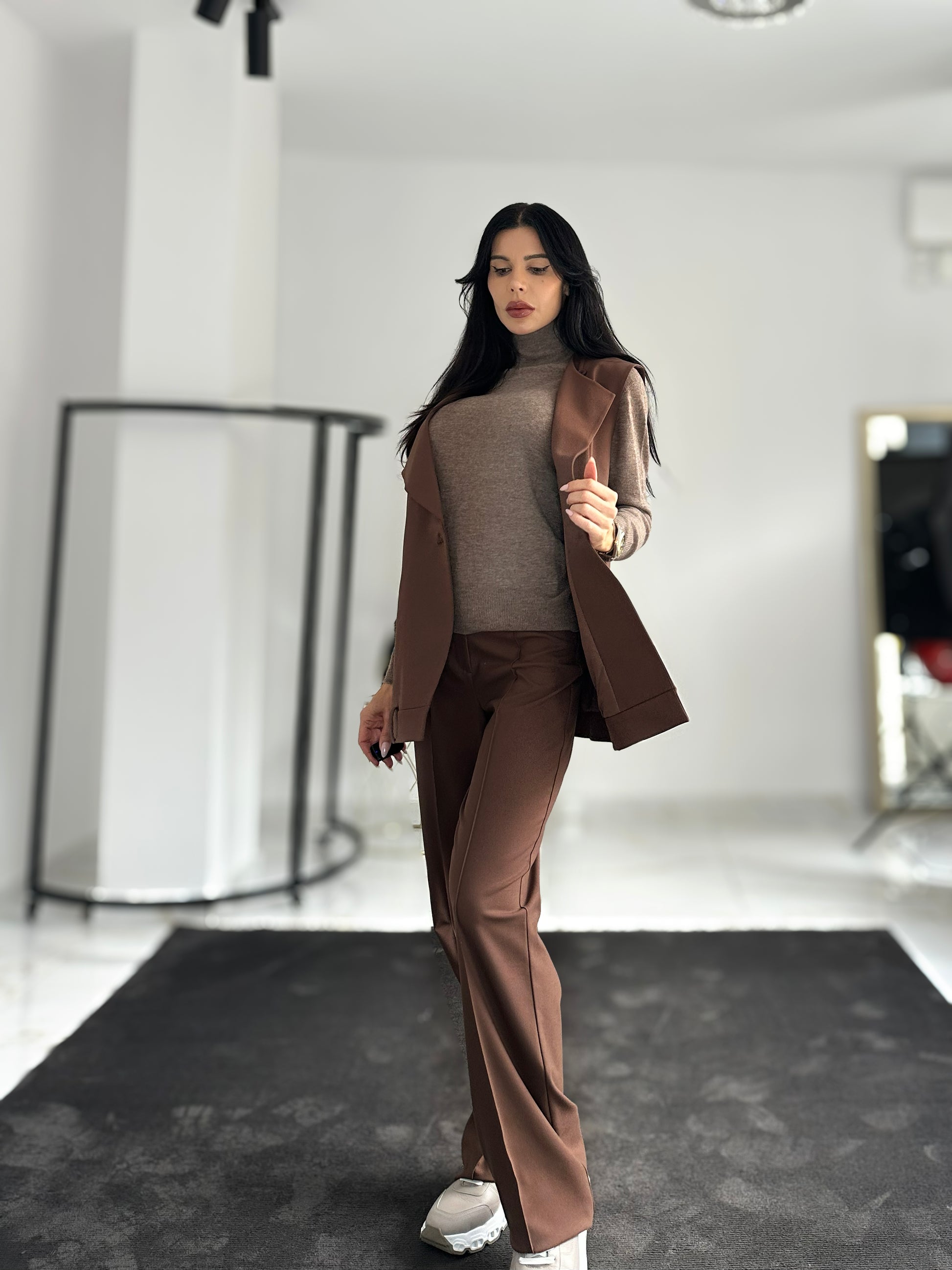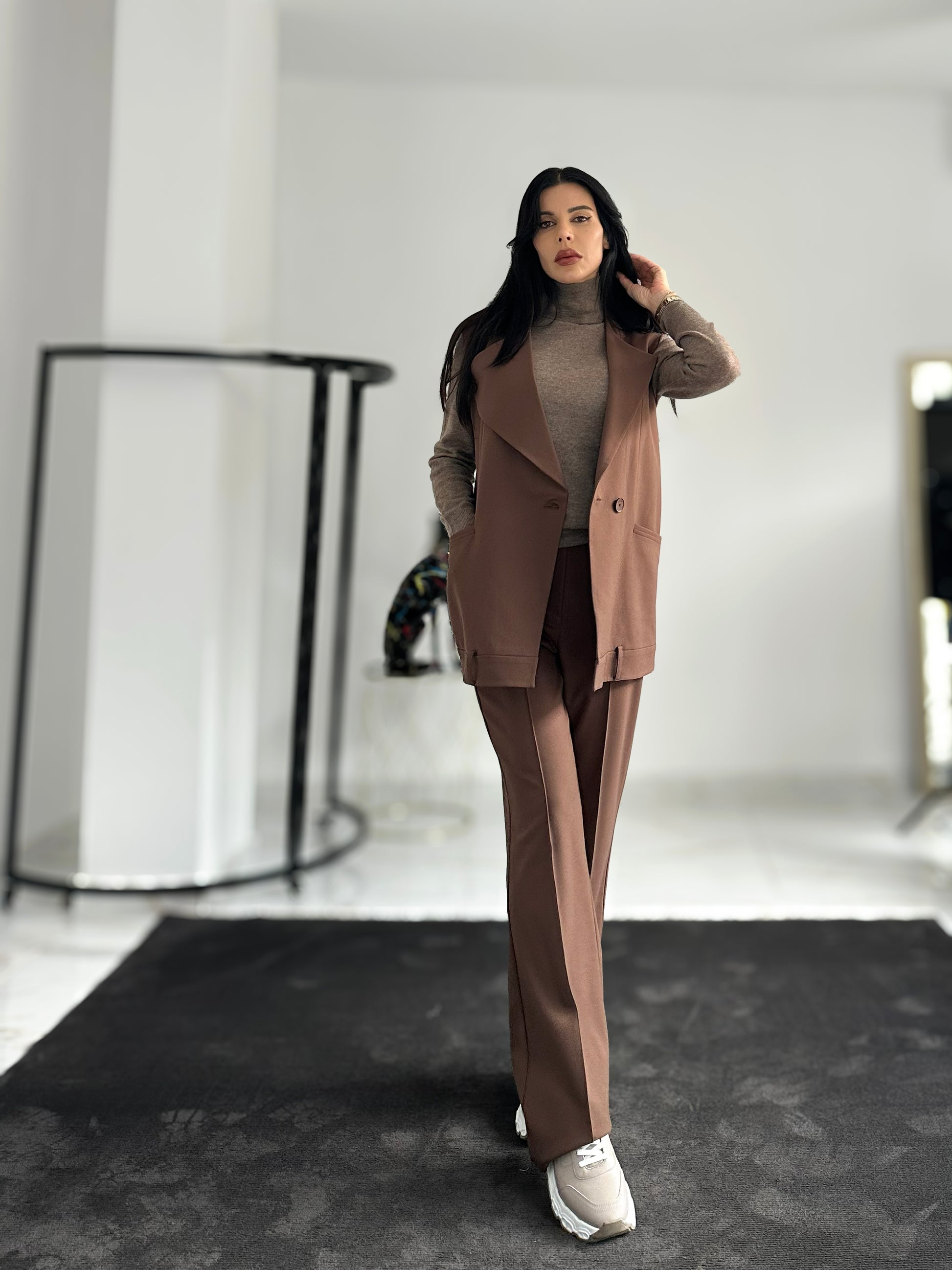Стилен двукомпонентен костюм в топъл кафяв нюанс, който съчетава модерна елегантност и минимализъм. Създаден от висококачествена смесена материя с лека структура, той е едновременно удобен и изключително изискан.
