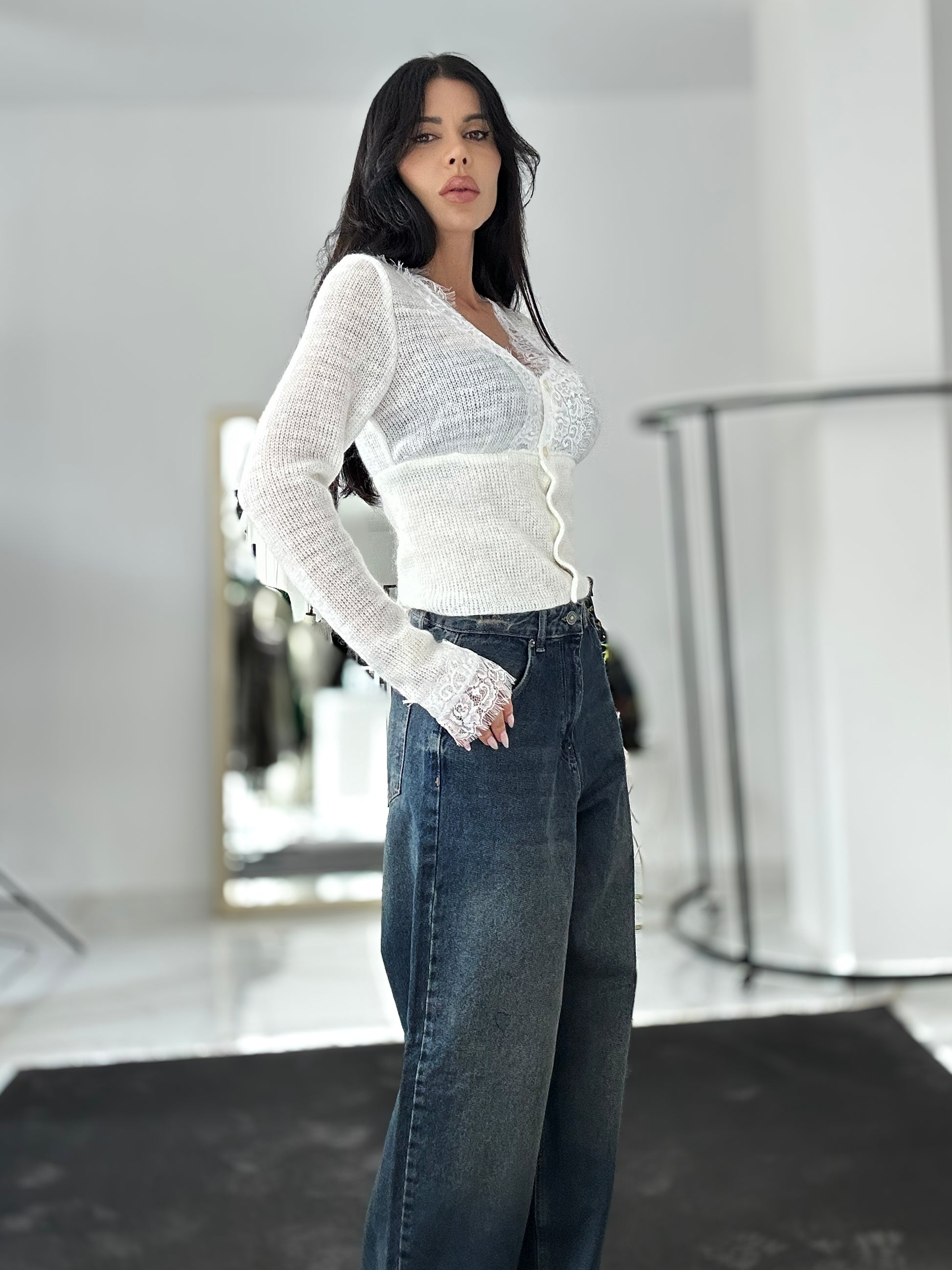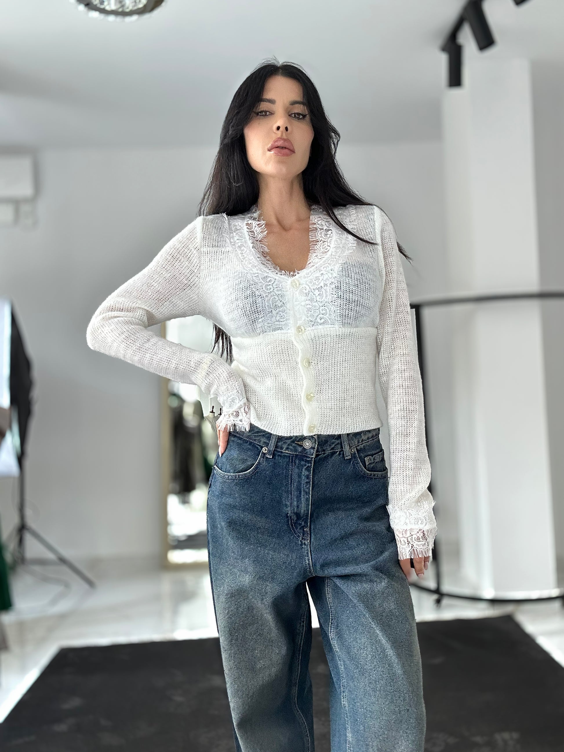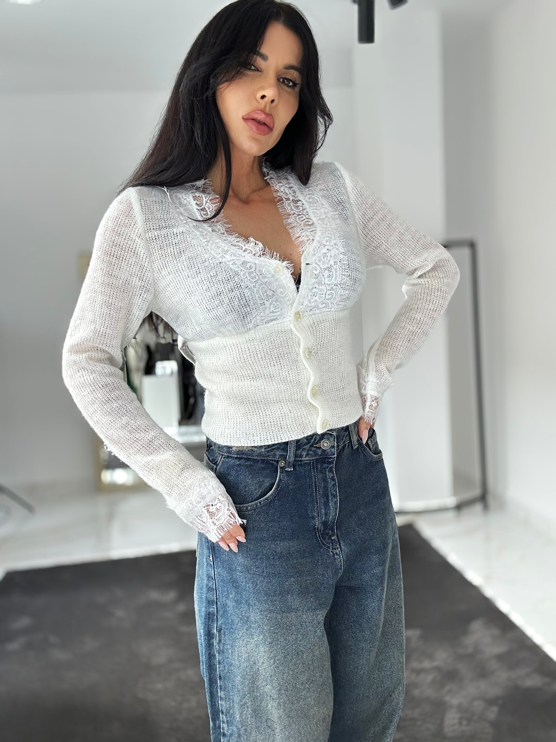 Акцентът е върху ефирната дантела по деколтето и предната част, която придава нежност и луксова естетика. Закопчава се с перлени копчета, добавяйки още една нотка елегантност. Лека, топла и мека на допир — идеалният избор за романтични вечери, ежедневни елегантни визии или специални поводи.