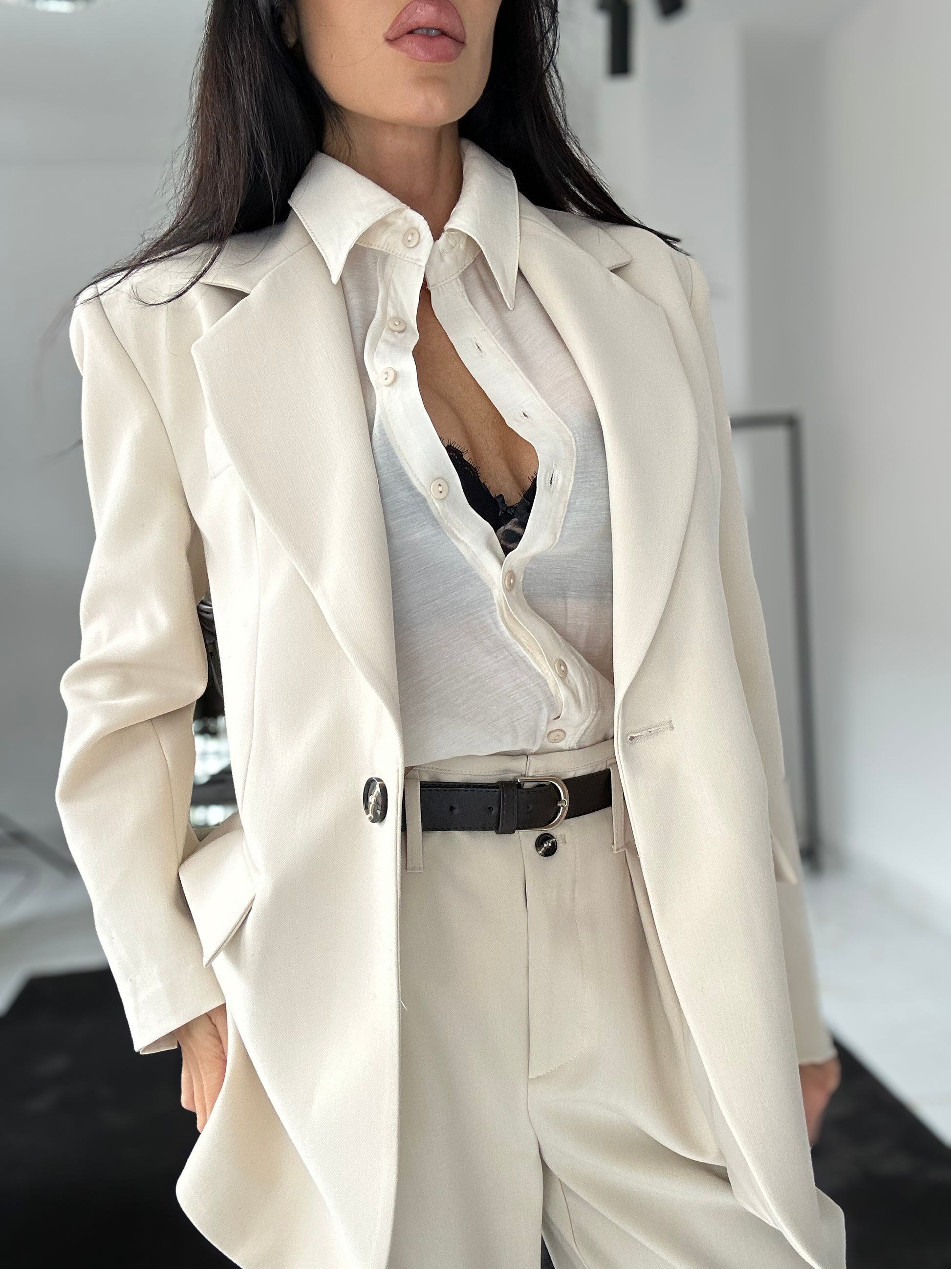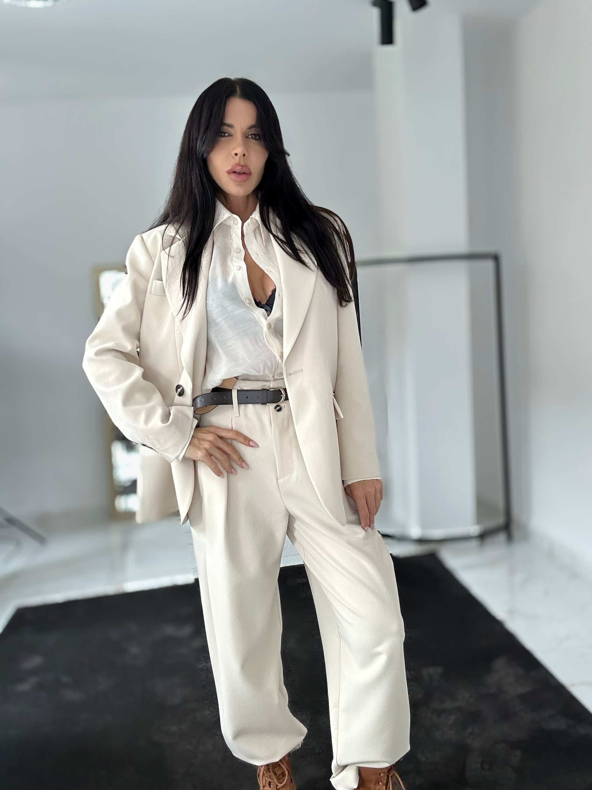 Перфектен избор за офис, бизнес срещи или вечерен коктейл — костюмът "Classique in ecru“ излъчва увереност и изтънченост.