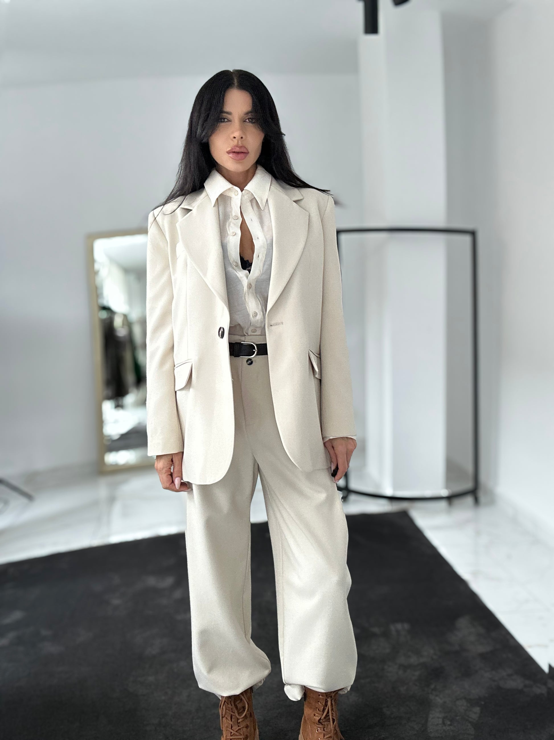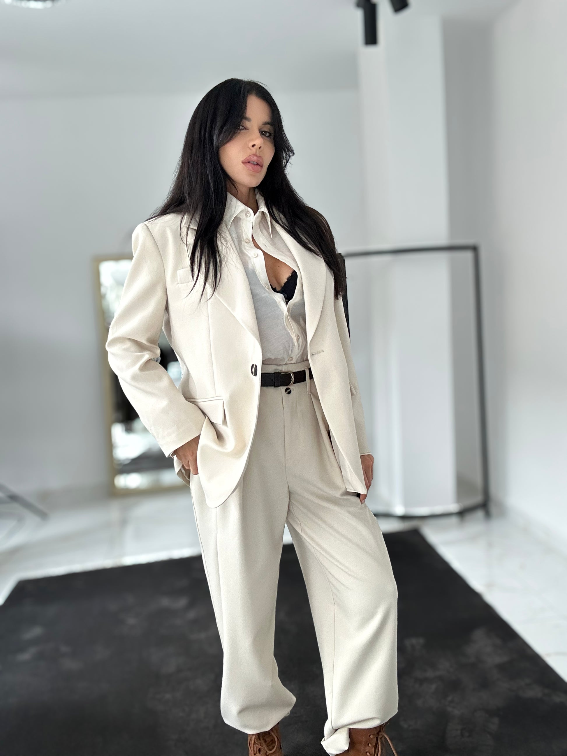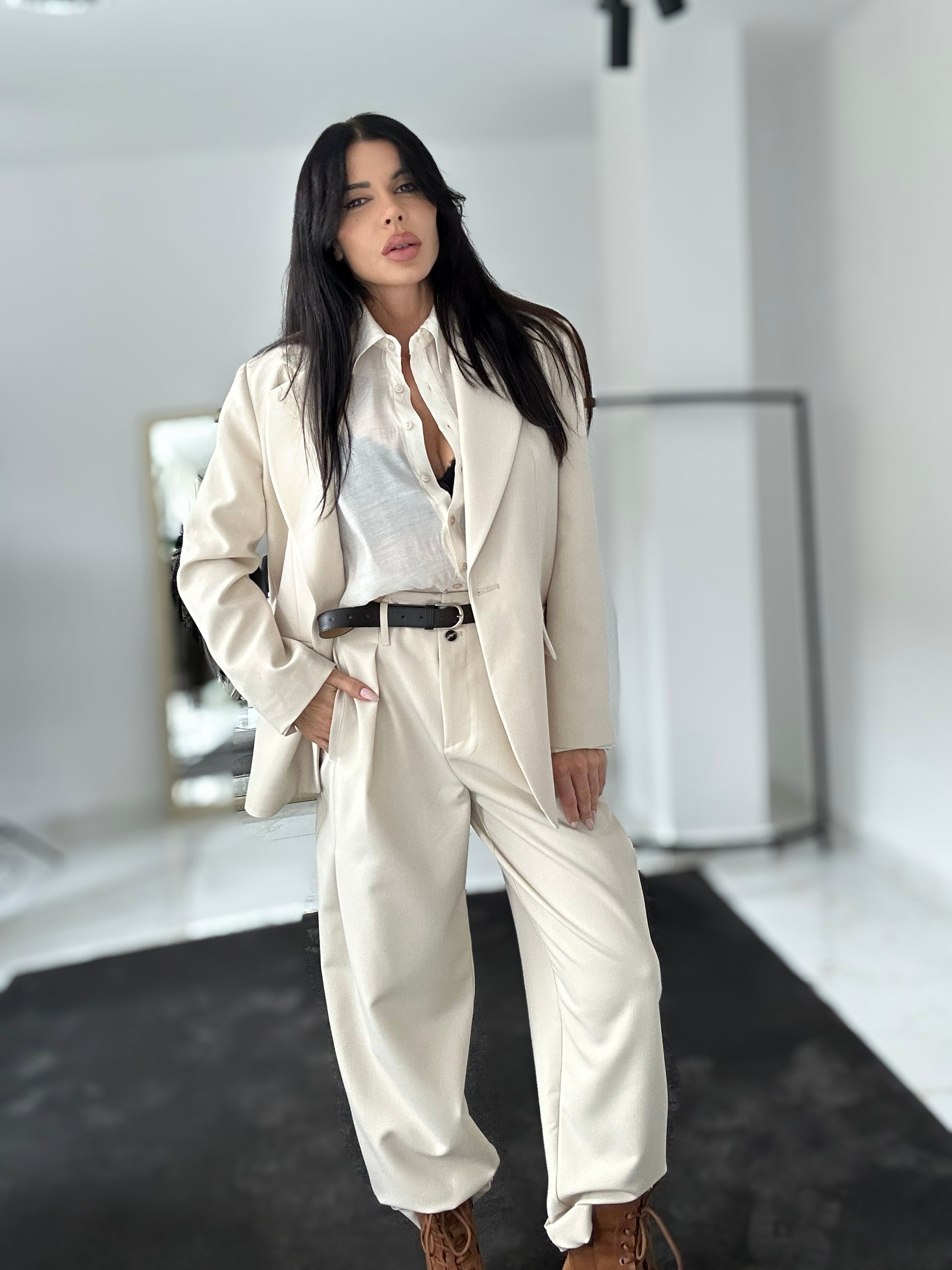 Елегантен костюм от сако и панталон в мек екрю нюанс — съчетание на изчистен минимализъм и луксозно усещане. Изработен от висококачествена креп материя, костюмът предлага комфорт и съвършен силует.