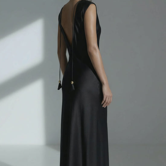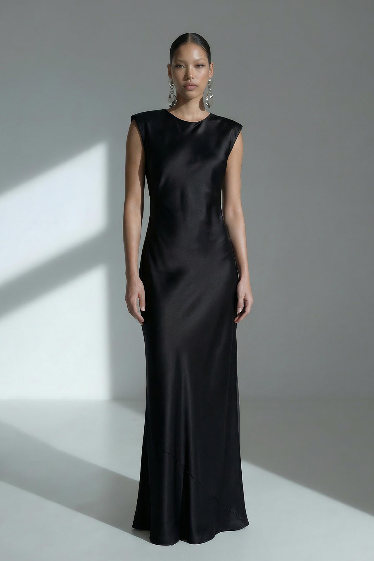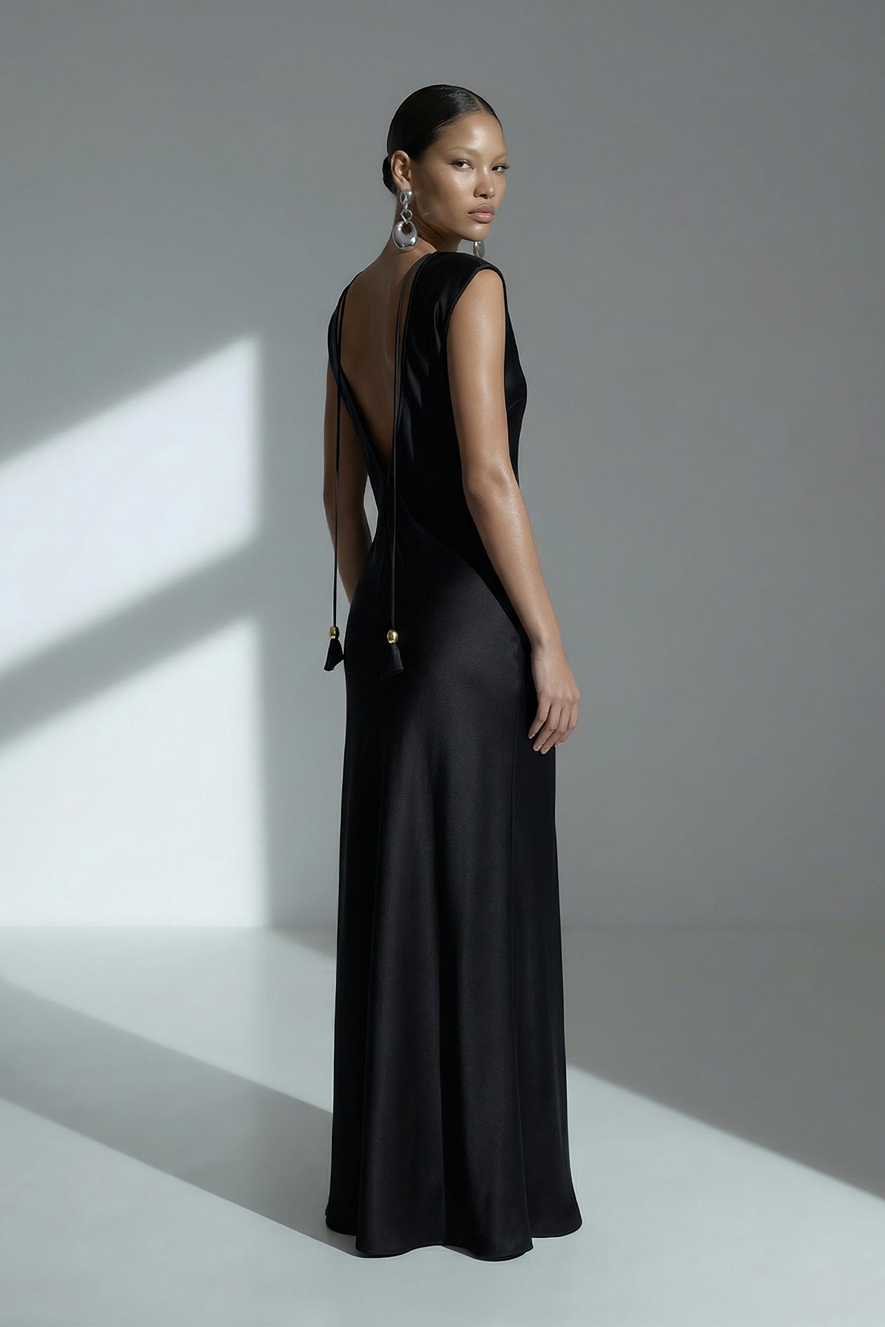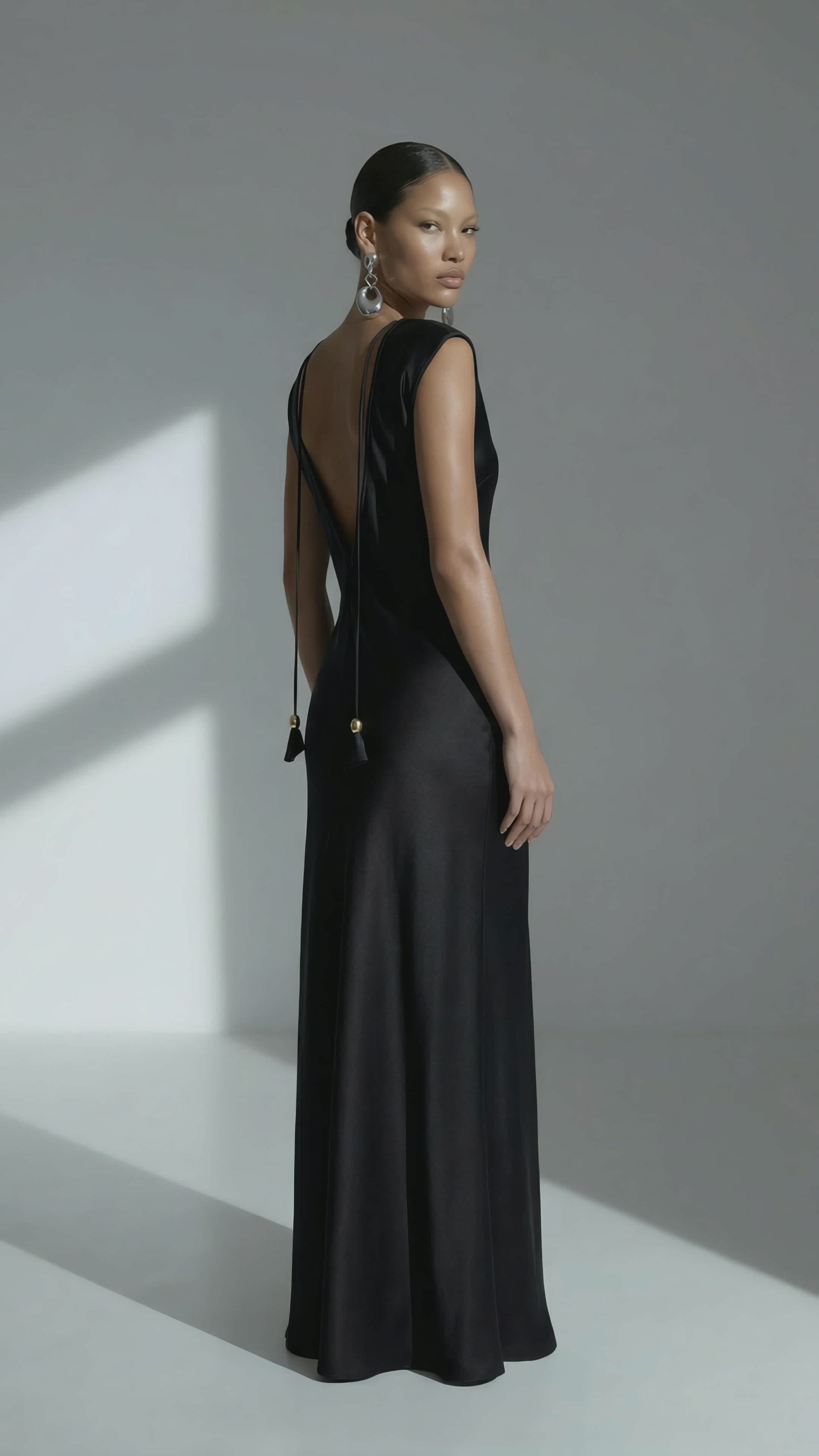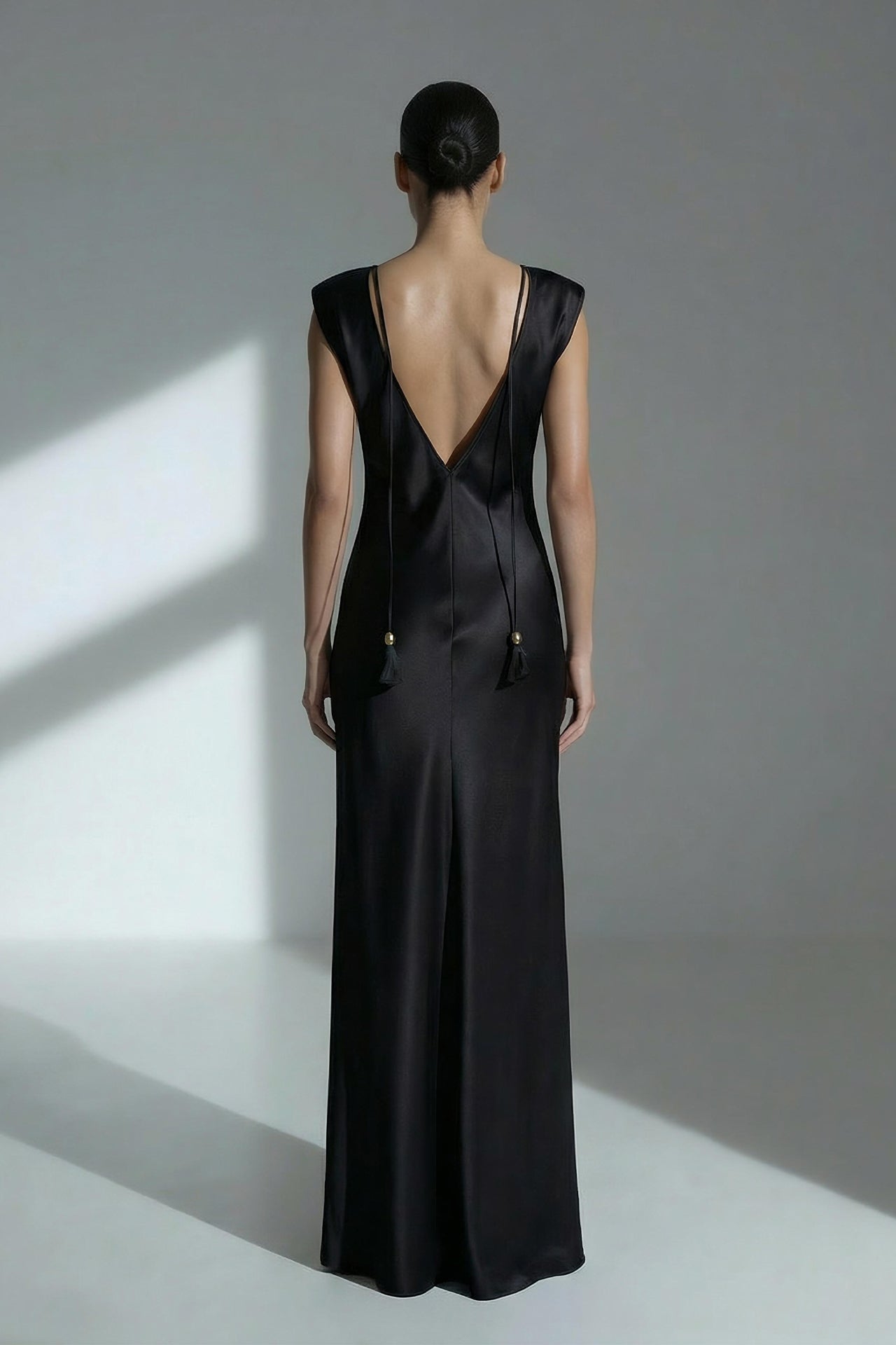 Детайли: Минималистична рокля с изчистена предница и елегантна линия. Дълбоко V-образно деколте на гърба. Фино оформени рамене и диагонален шев в долната част на роклята, който придава движение и модерен акцент.