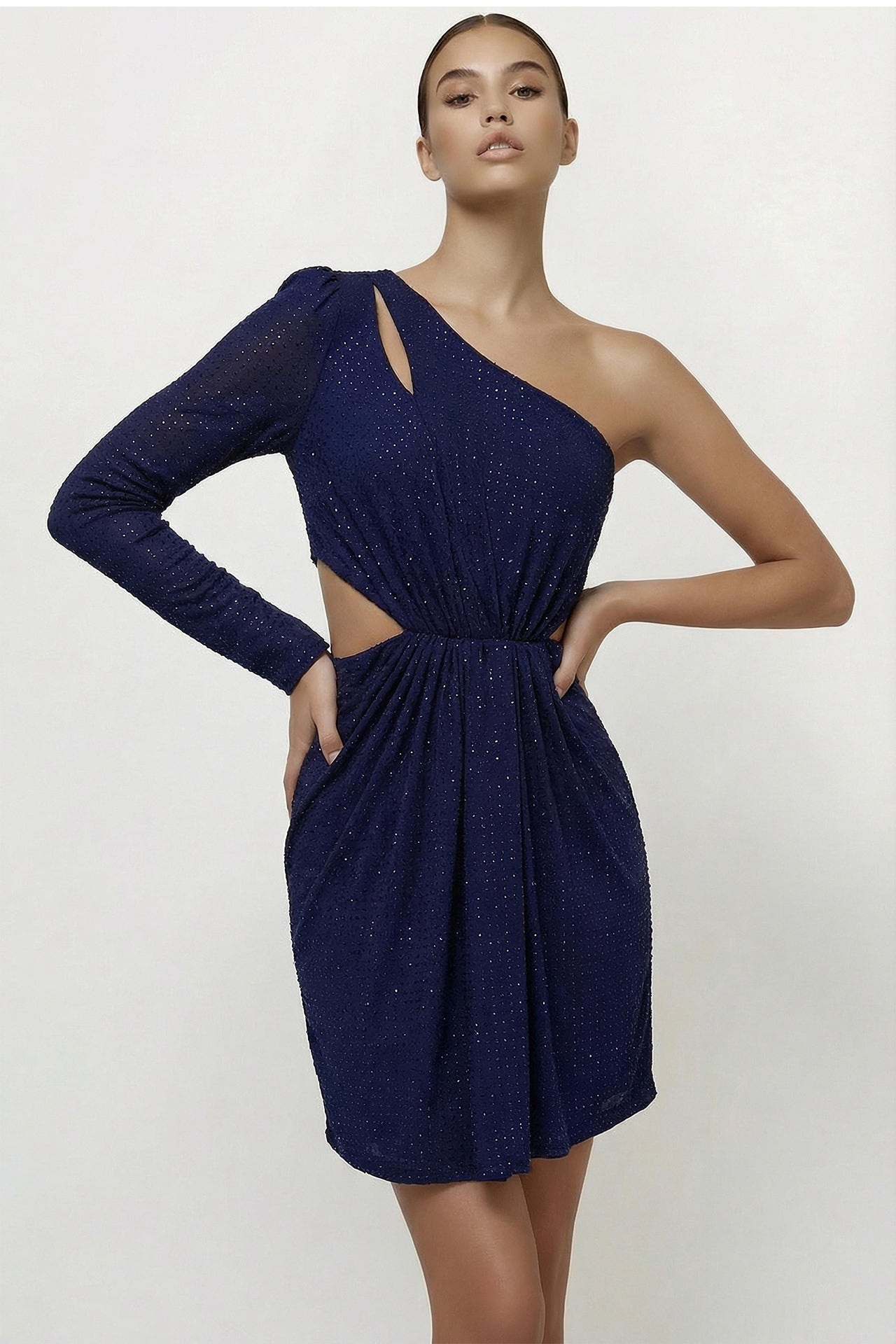 Роклята впечатлява с изрязан детайл в горната част и акцентирани странични отвори, които подчертават линията на тялото. Драпировката е фокусна точка в центъра, събираща плата по елегантен начин. Фино нанесените камъчета добавят мек блясък и правят модела идеален за вечерни събития.