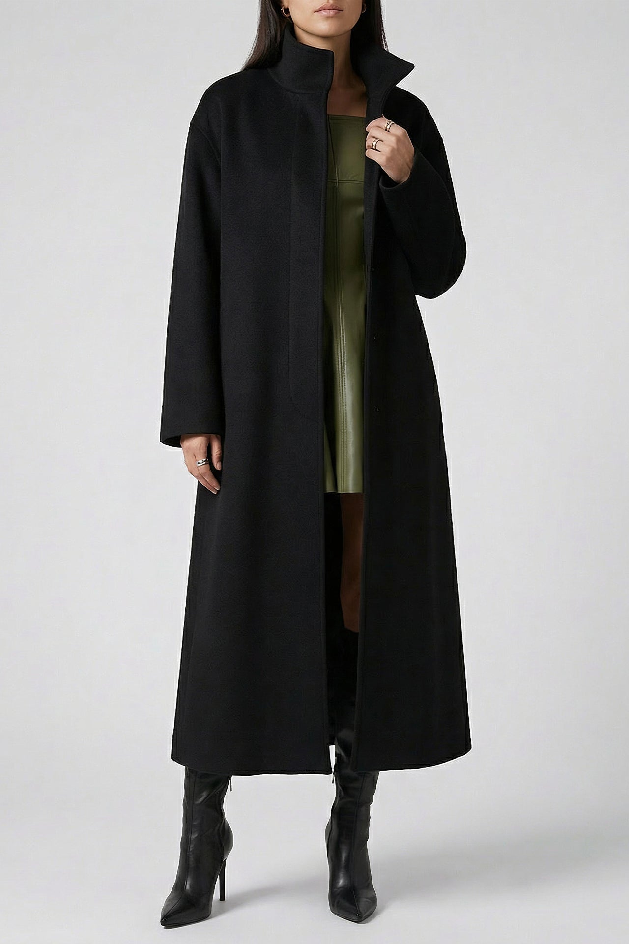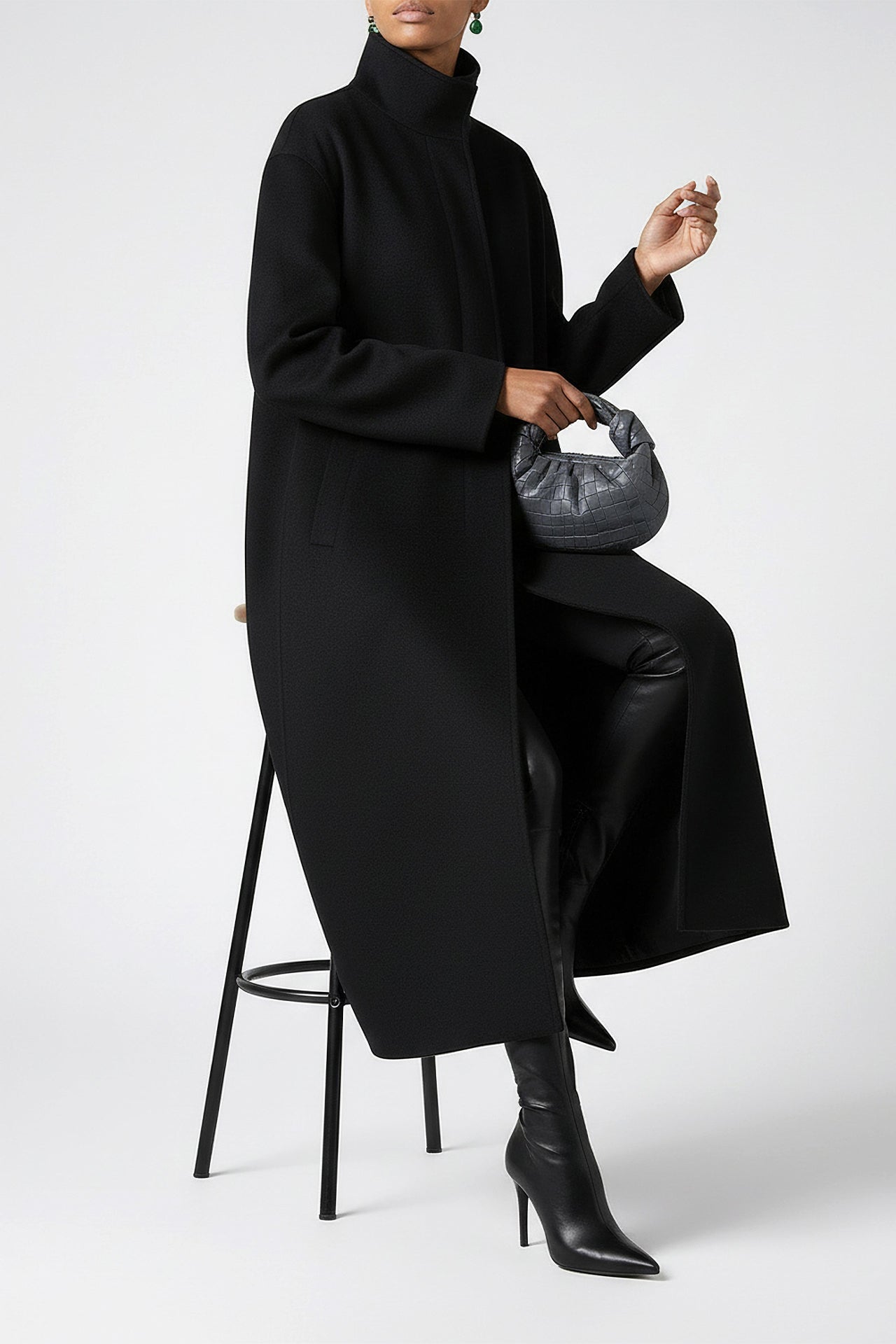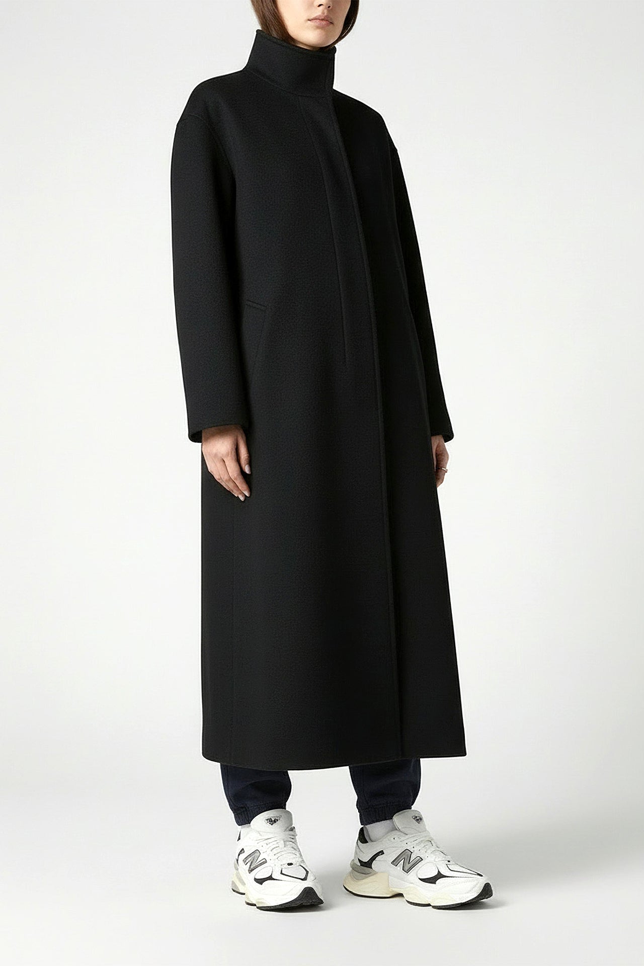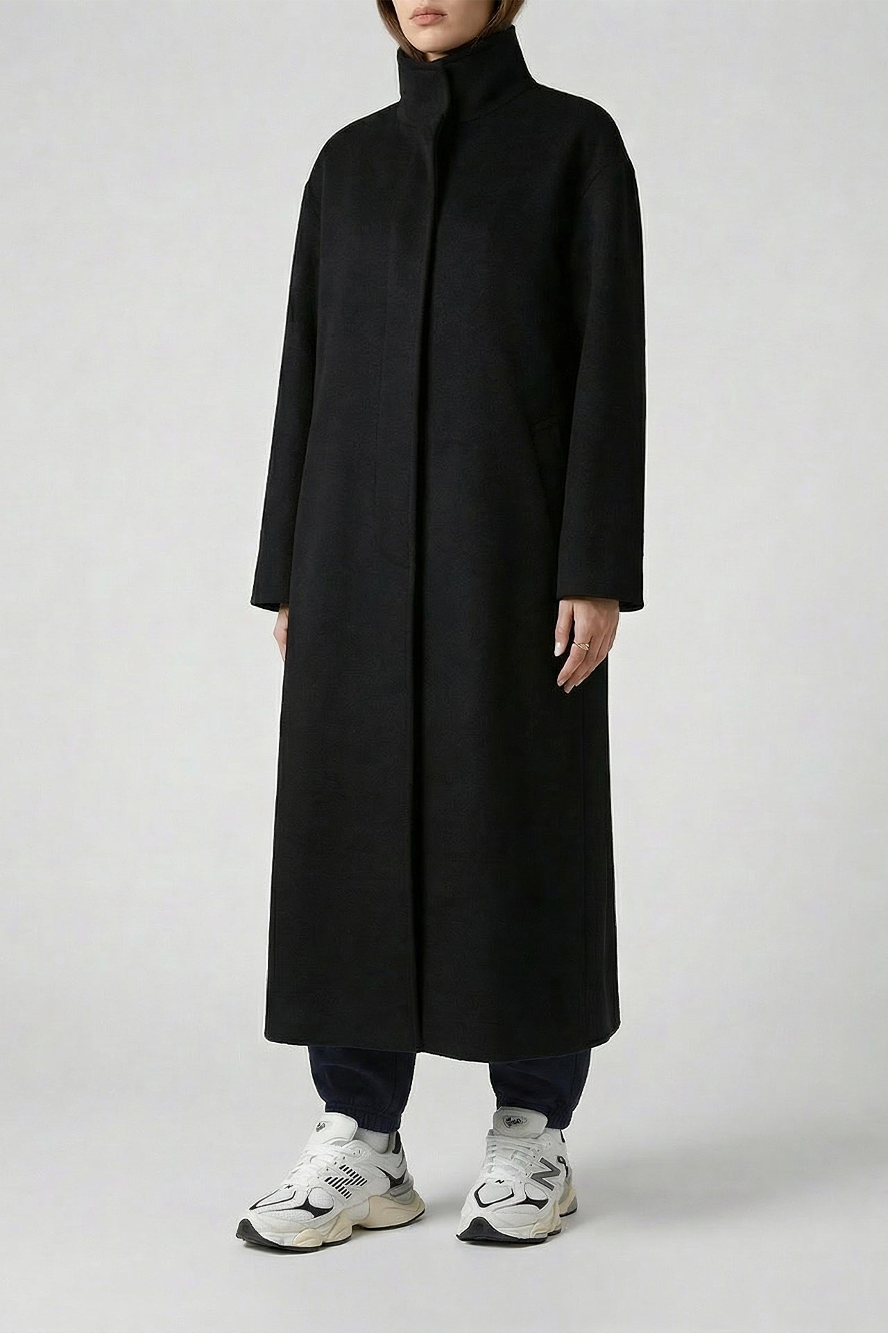 Луксозно дълго палто в мек кремав нюанс, което впечатлява със семпъл, но изключително елегантен силует. Моделът е с права линия, скрито закопчаване и изчистен дизайн, който позволява лесно комбиниране с всякакви стилове – от ежедневни до по-официални визии. Свободната кройка и дължината осигуряват комфорт и топлина, като подчертават изтънченото усещане за модерна класика.