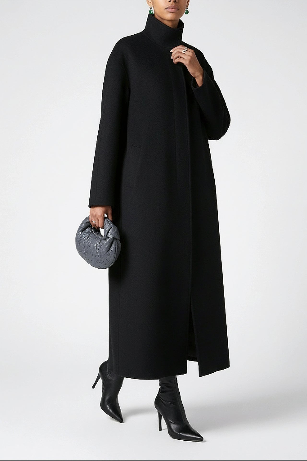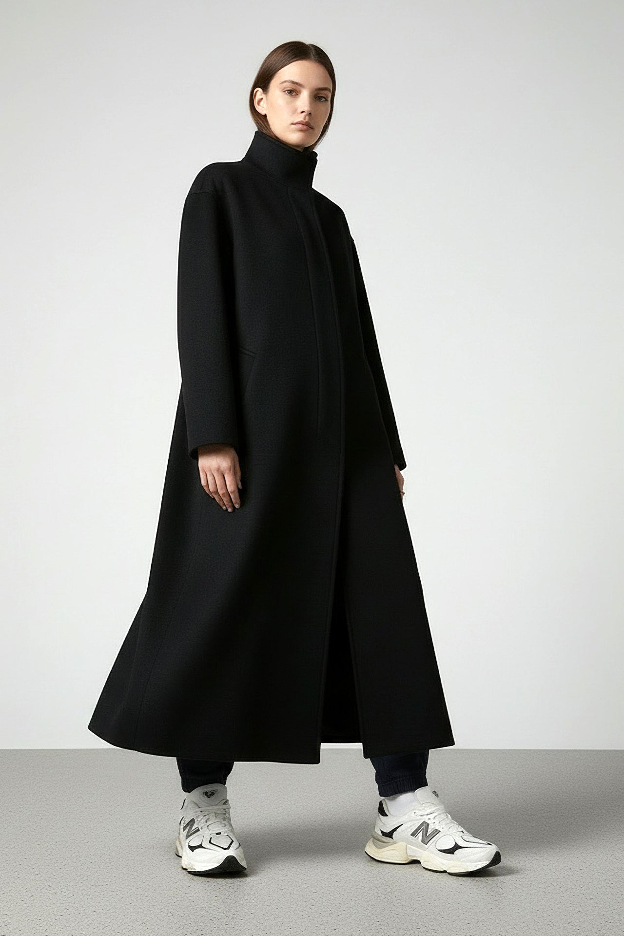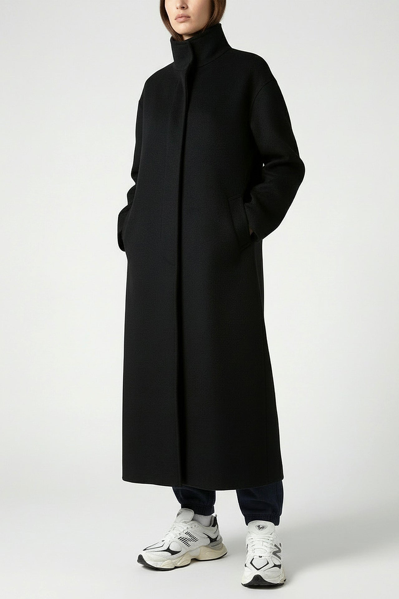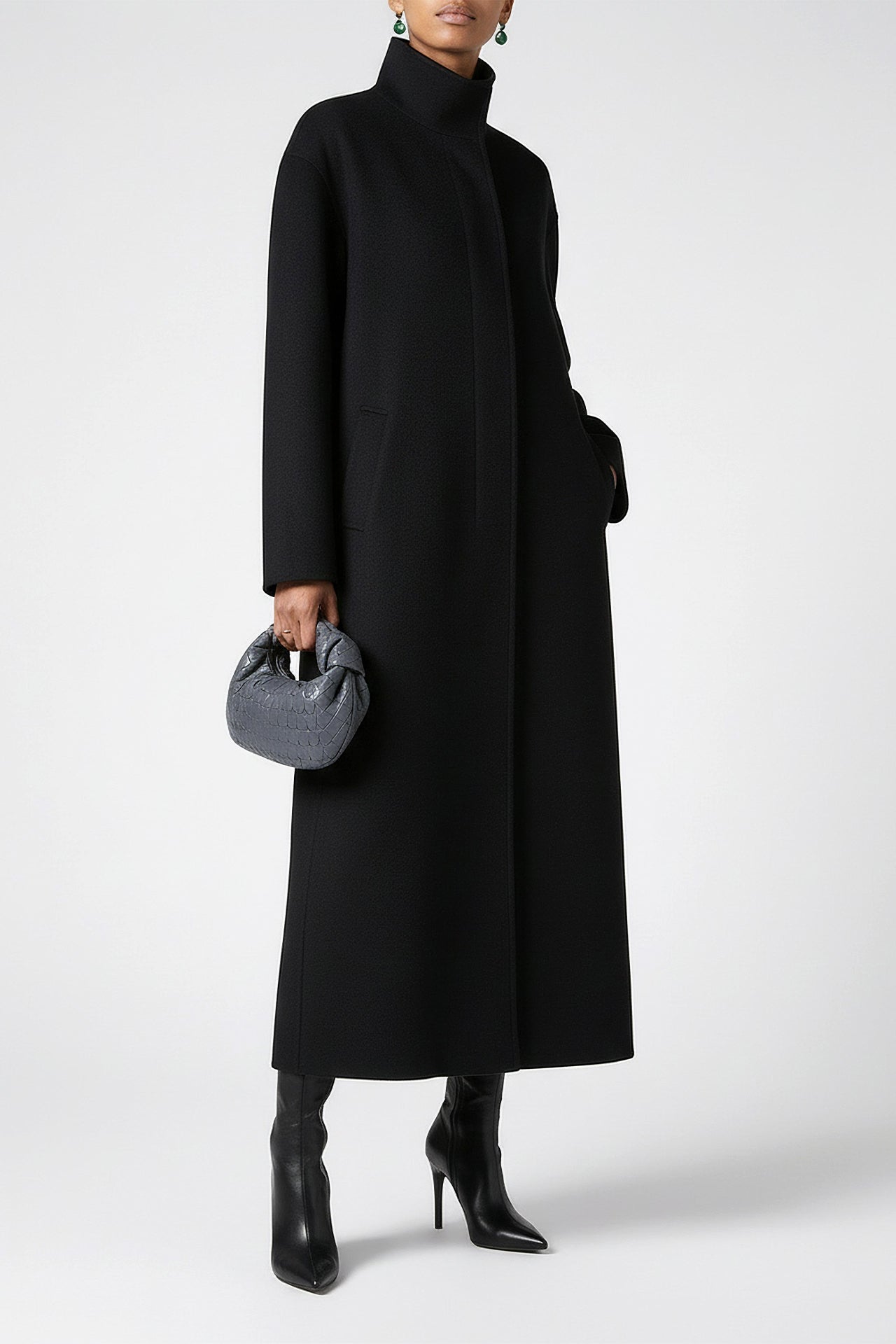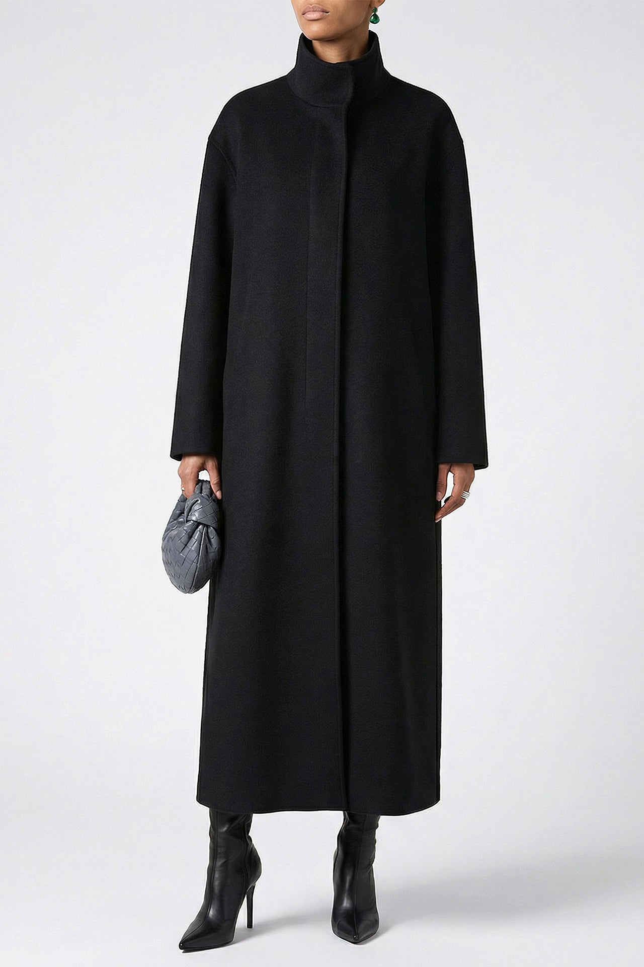 Луксозно дълго палто в мек кремав нюанс, което впечатлява със семпъл, но изключително елегантен силует. Моделът е с права линия, скрито закопчаване и изчистен дизайн, който позволява лесно комбиниране с всякакви стилове – от ежедневни до по-официални визии. Свободната кройка и дължината осигуряват комфорт и топлина, като подчертават изтънченото усещане за модерна класика.