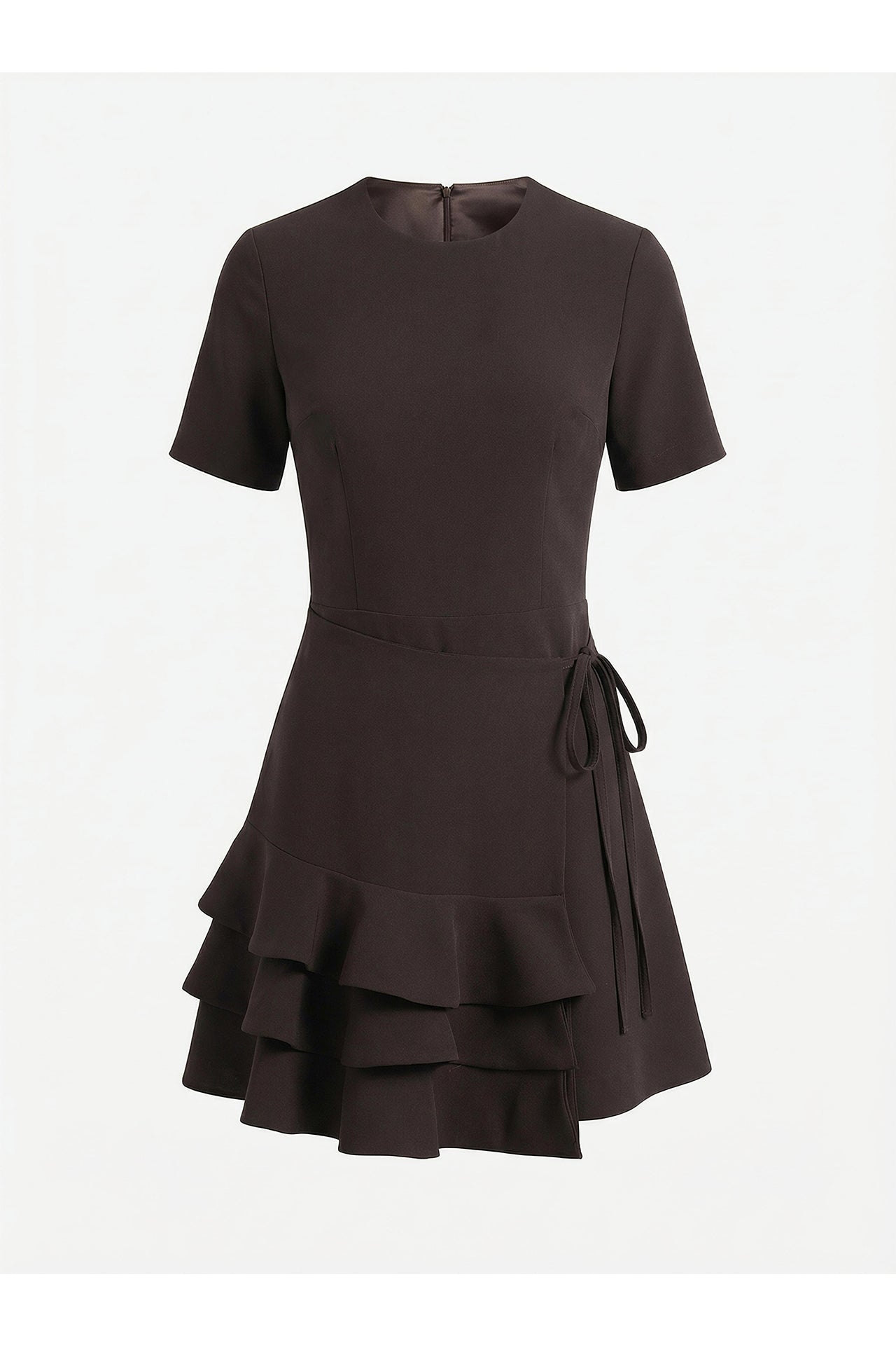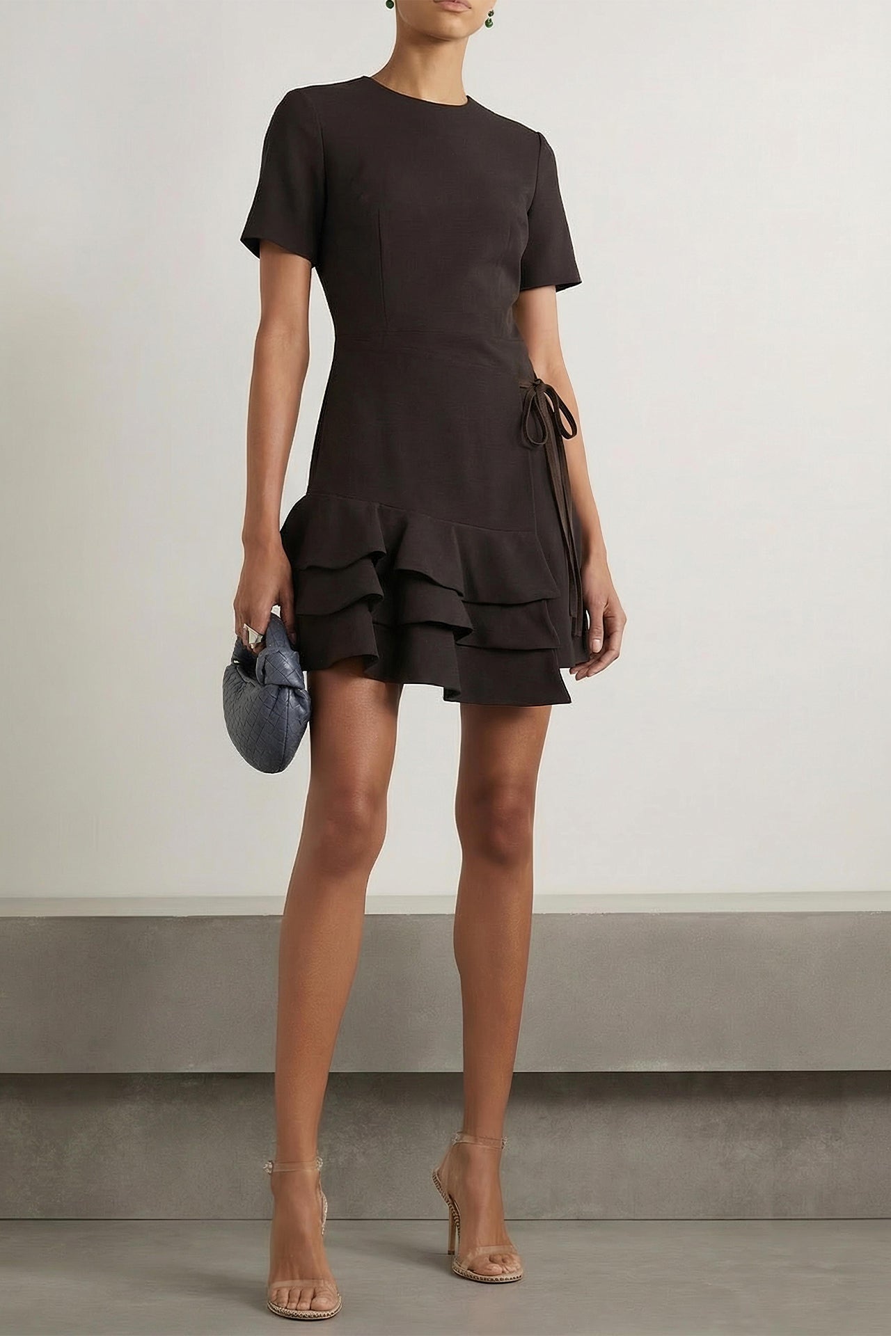 Елегантна мини рокля в наситен тъмен нюанс, която съчетава минимализъм в горната част с игрив, женствен финал. Правата линия се прелива в многопластови волани, които придават движение и лекота. Деликатното странично връзване подчертава талията по фин и модерен начин.