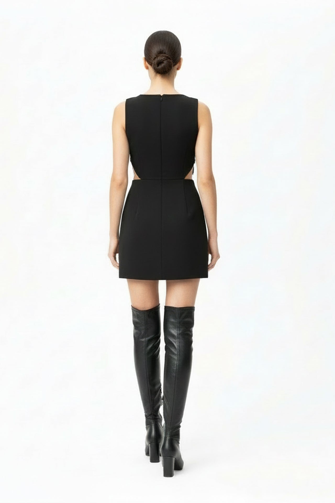 Sofia е модерна мини рокля с изчистен прав силует, който прегръща тялото и подчертава талията. Отворените страни придават ефирност и елегантна линия, която издължава фигурата. Дантела под формата на бралет.