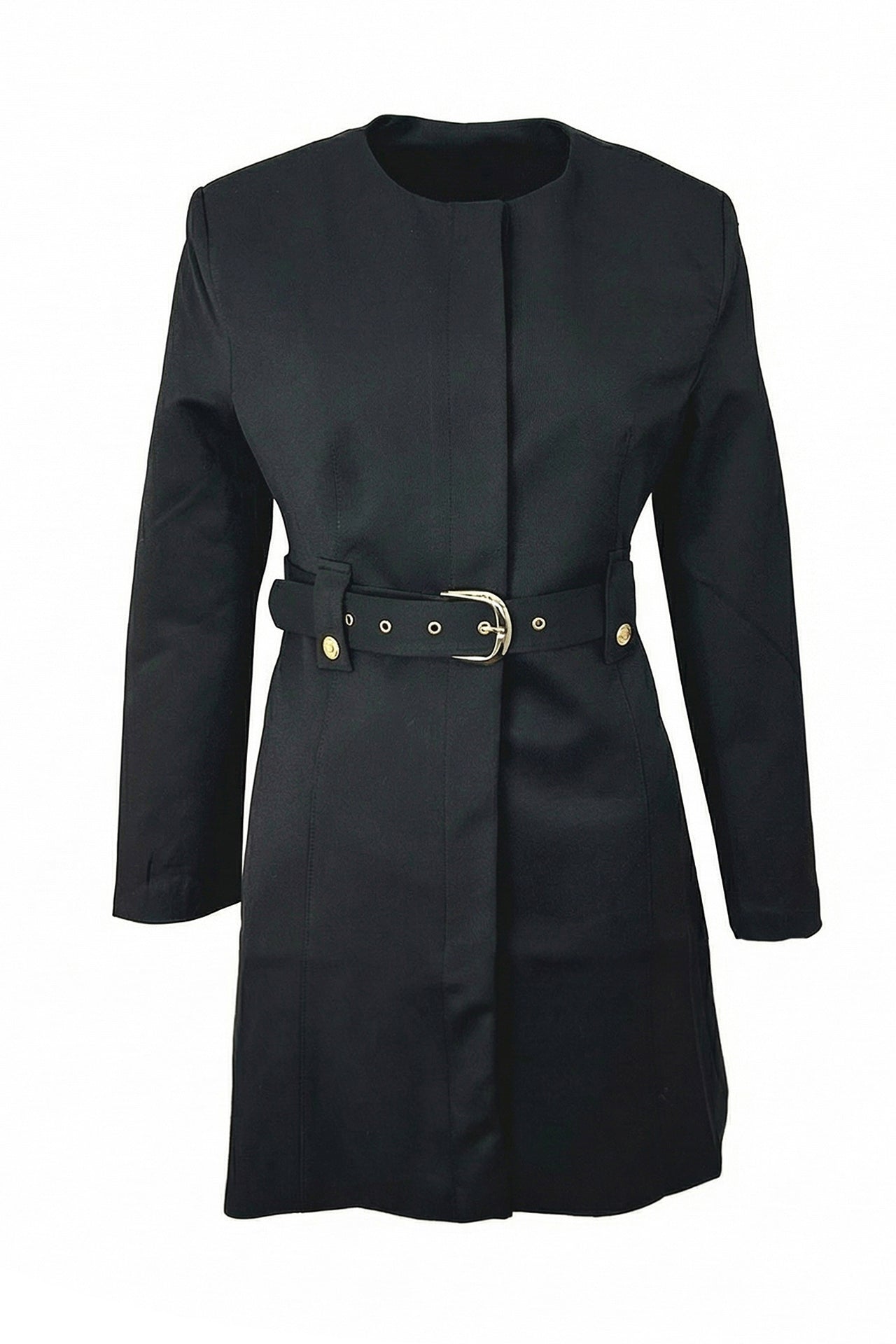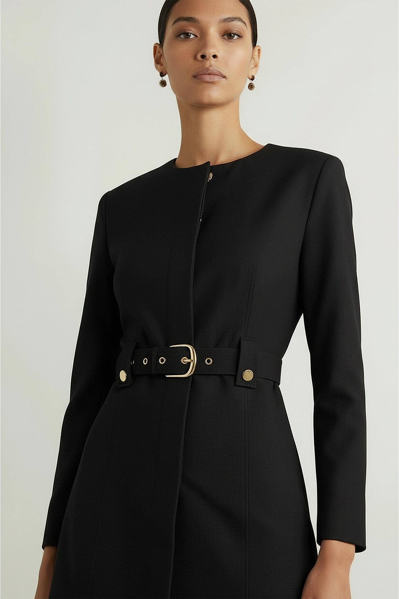 Дизайн: минималистична кройка тип сако с изчистено деколте и скрито закопчаване отпред. Колан с метална тока подчертава талията и придава архитектурна структура на фигурата.