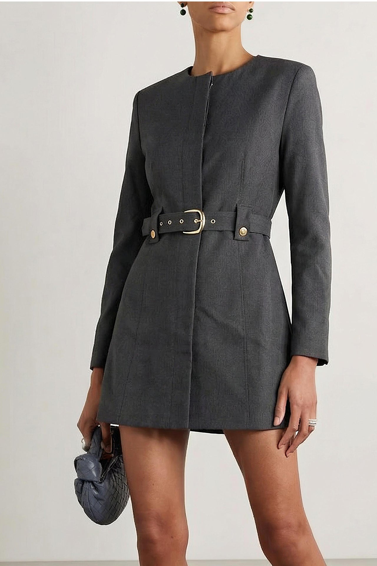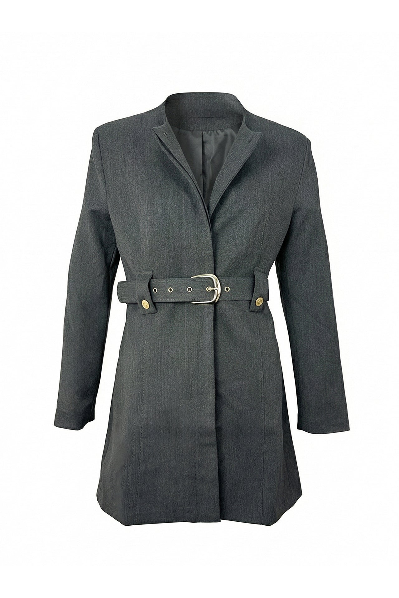 Дизайн: минималистична кройка тип сако с изчистено деколте и скрито закопчаване отпред. Колан с метална тока подчертава талията и придава архитектурна структура на фигурата.