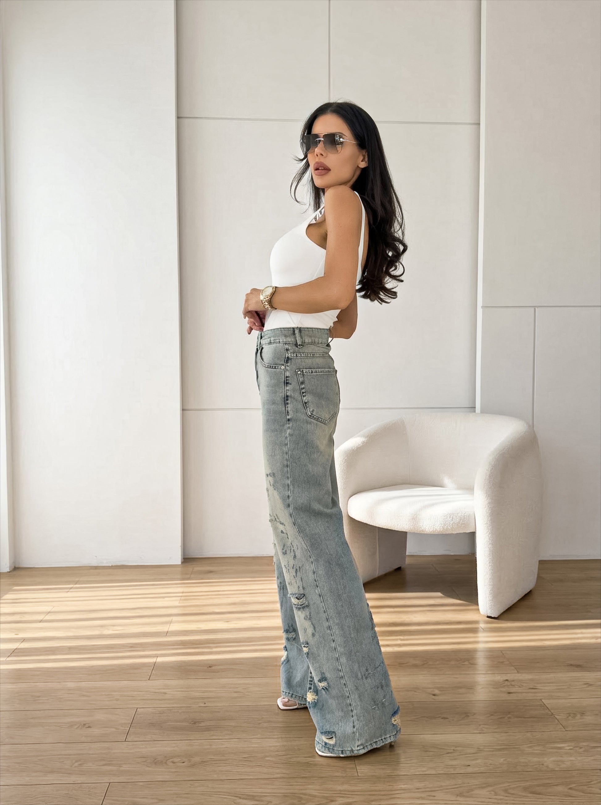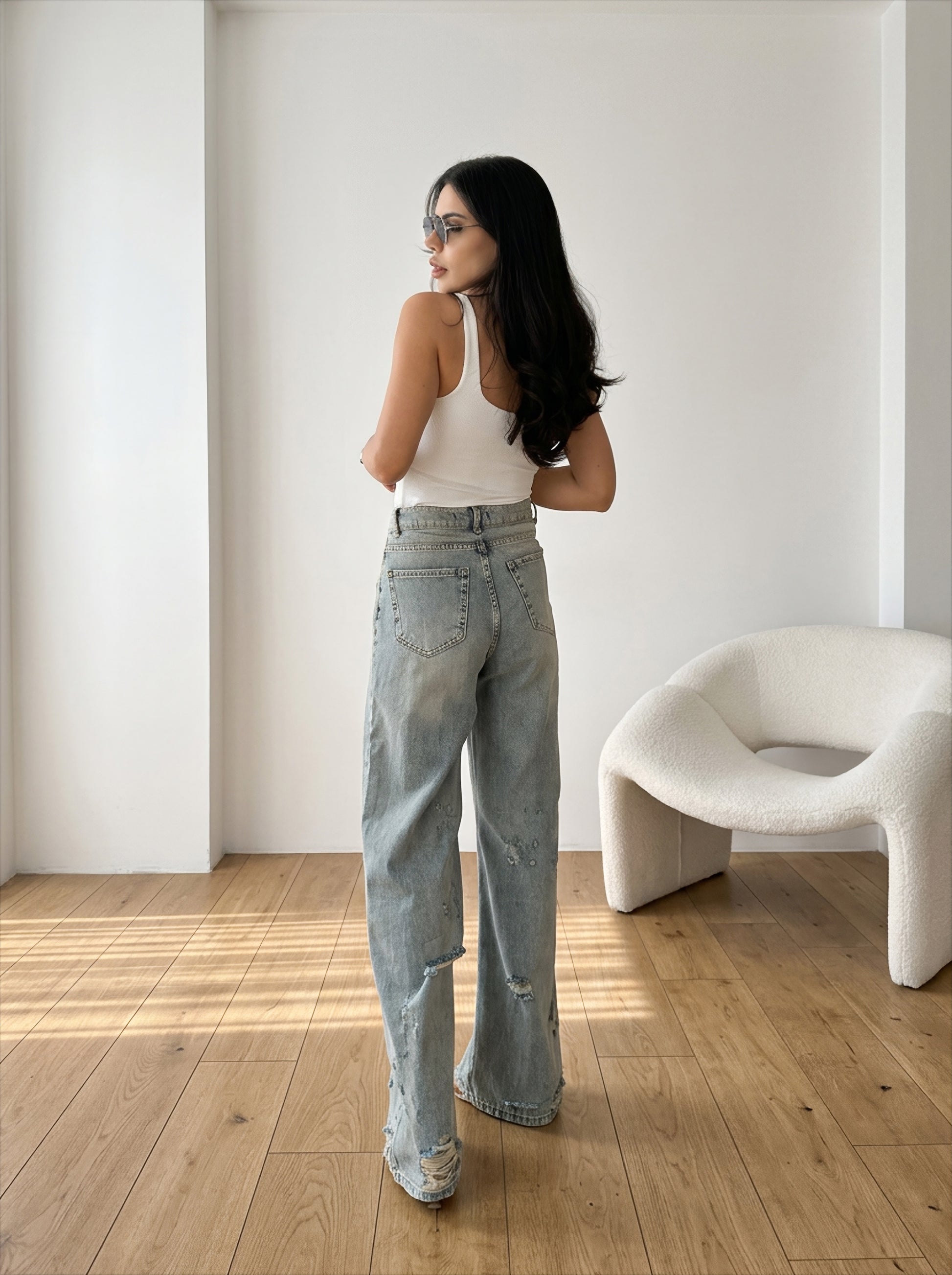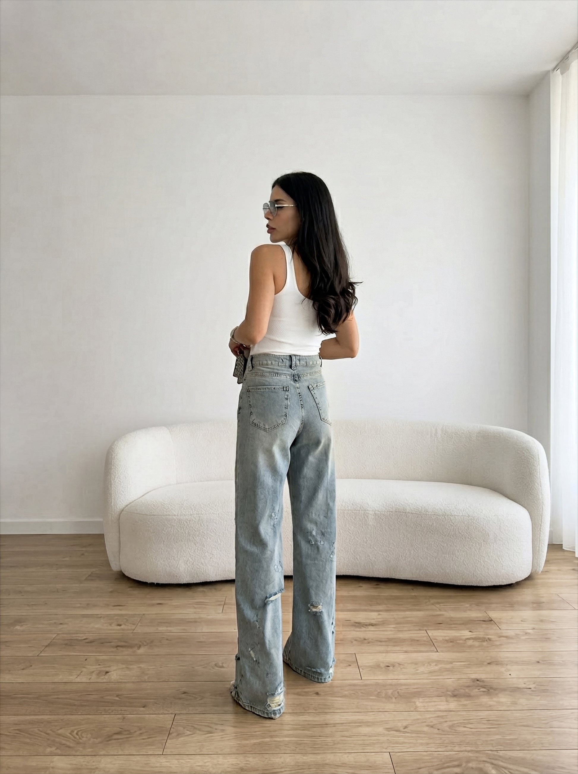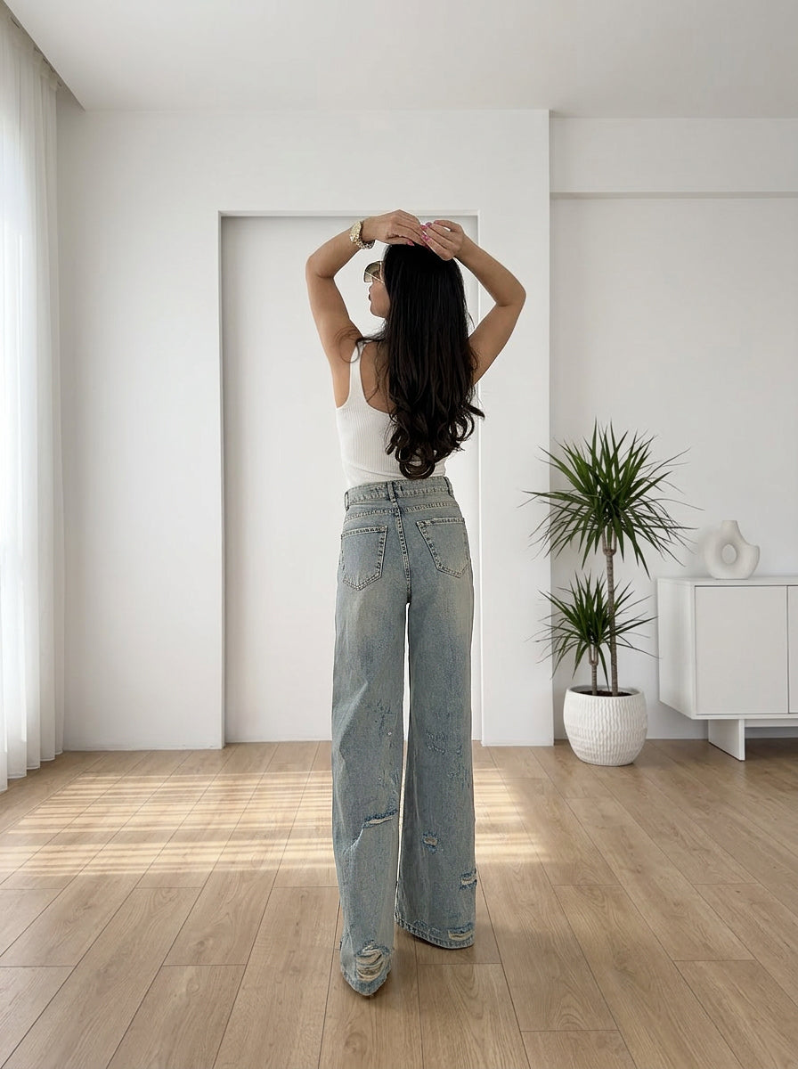 Модерни дънки с висока талия и свободна, права кройка, създадени за комфорт и стил в едно. Моделът е изработен от качествен деним с леко избелял ефект и артистични детайли на износване, които придават характер и актуално излъчване.