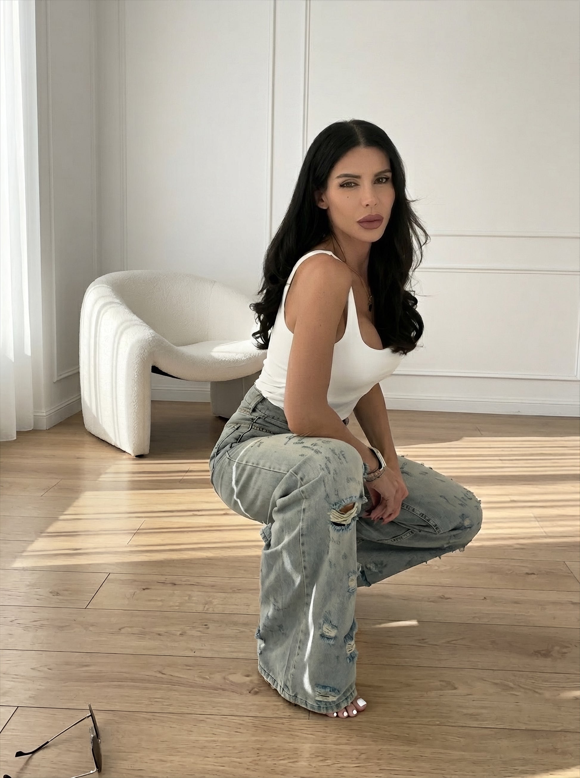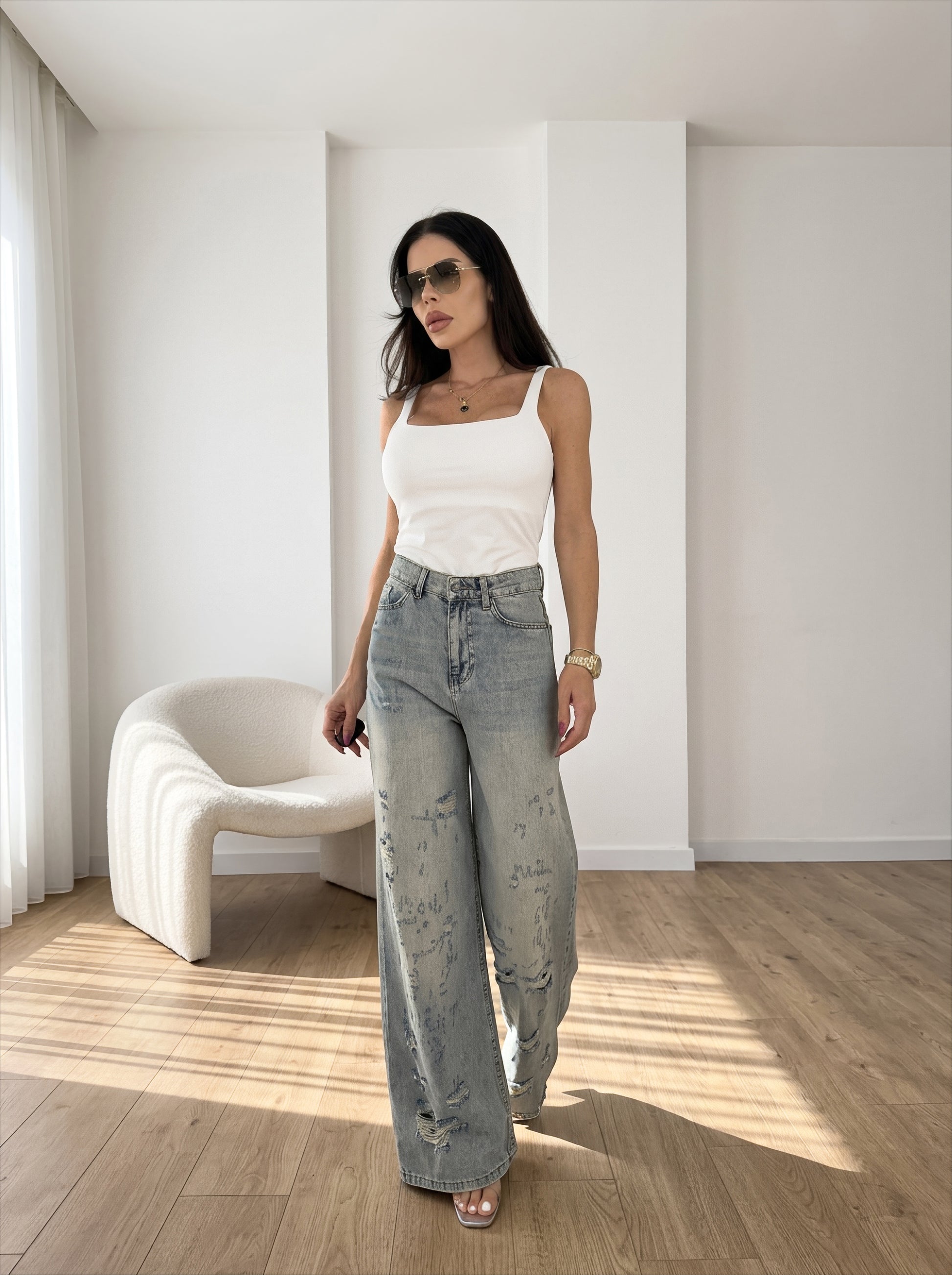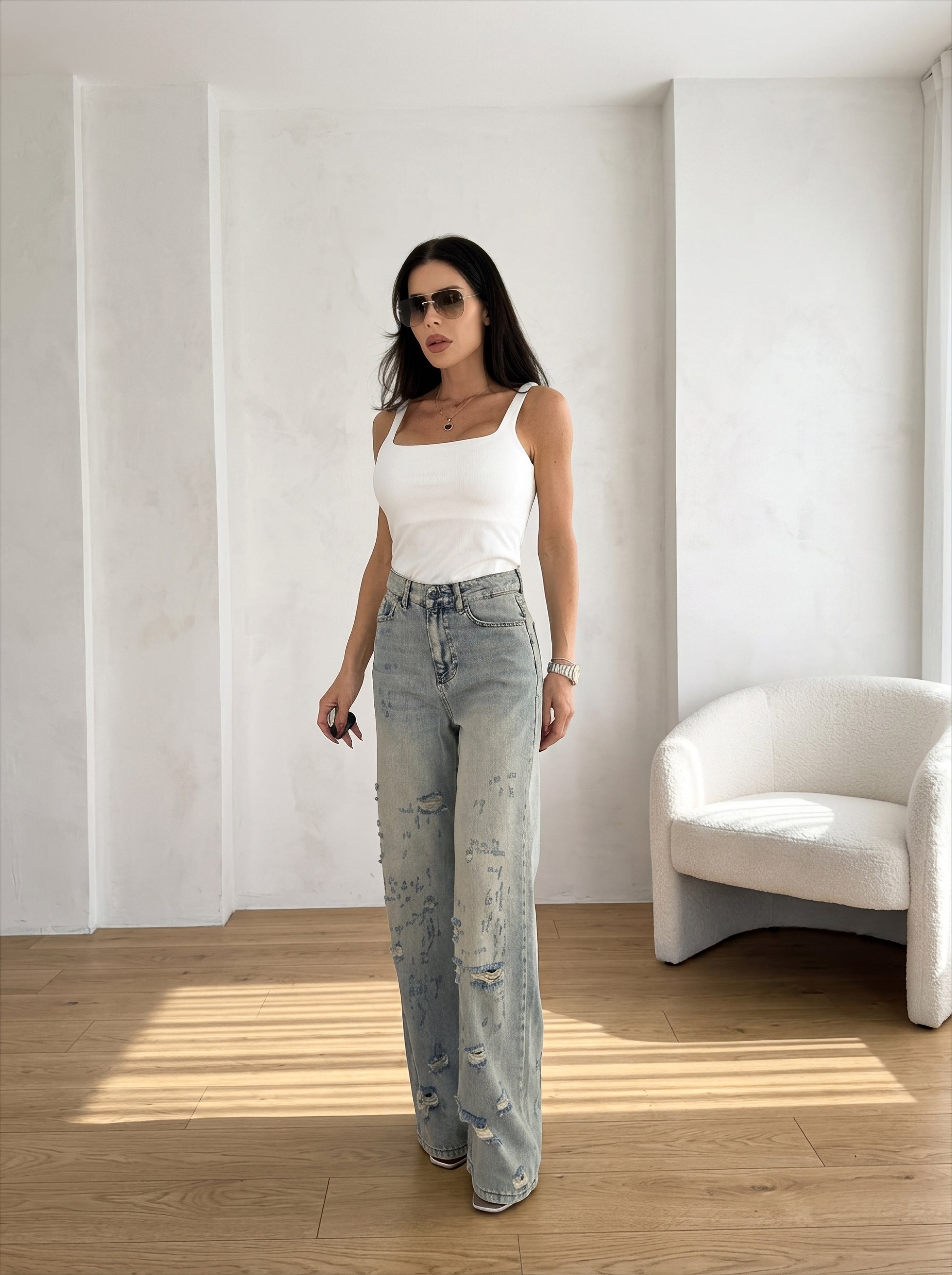 Модерни дънки с висока талия и свободна, права кройка, създадени за комфорт и стил в едно. Моделът е изработен от качествен деним с леко избелял ефект и артистични детайли на износване, които придават характер и актуално излъчване.