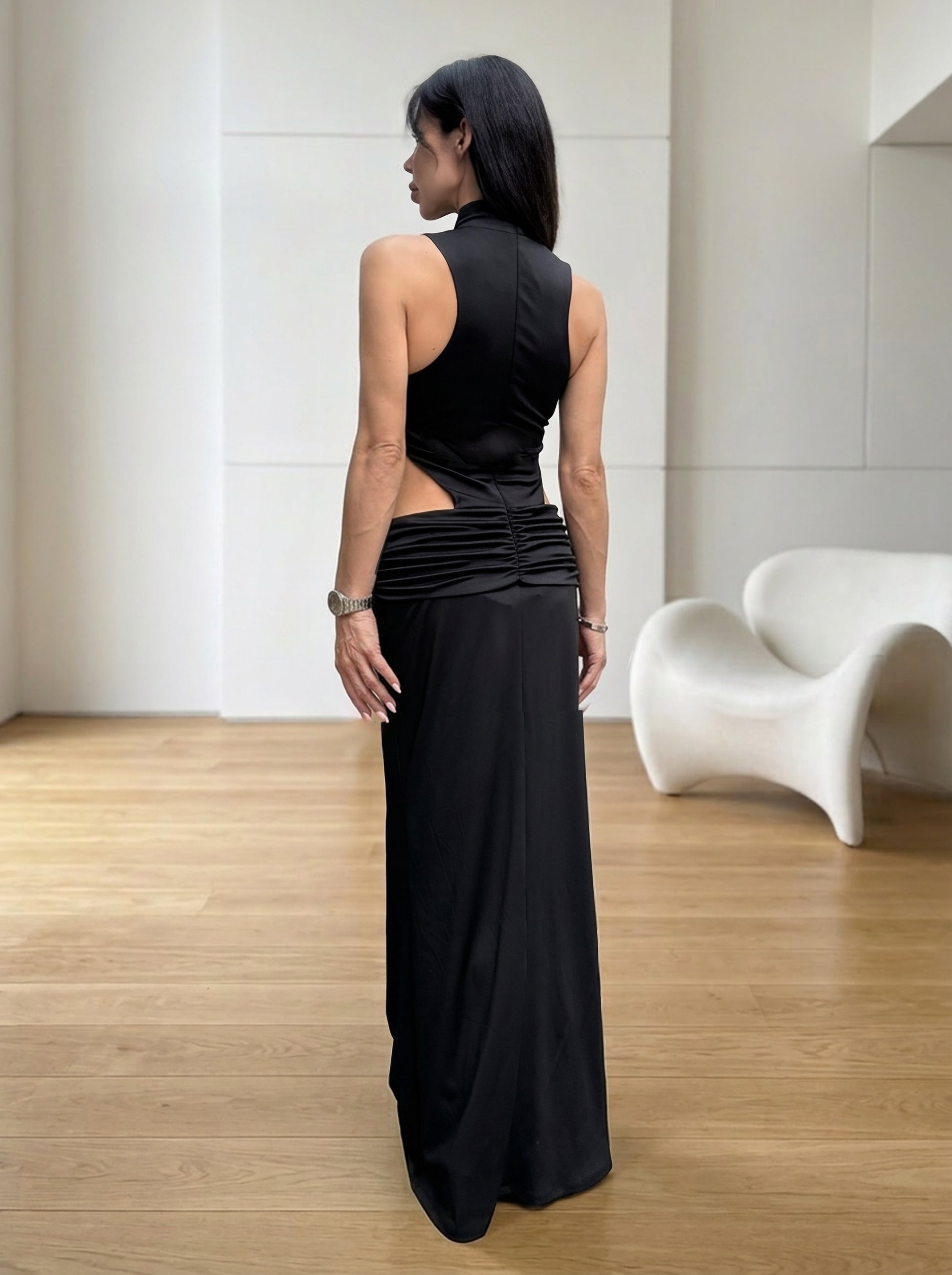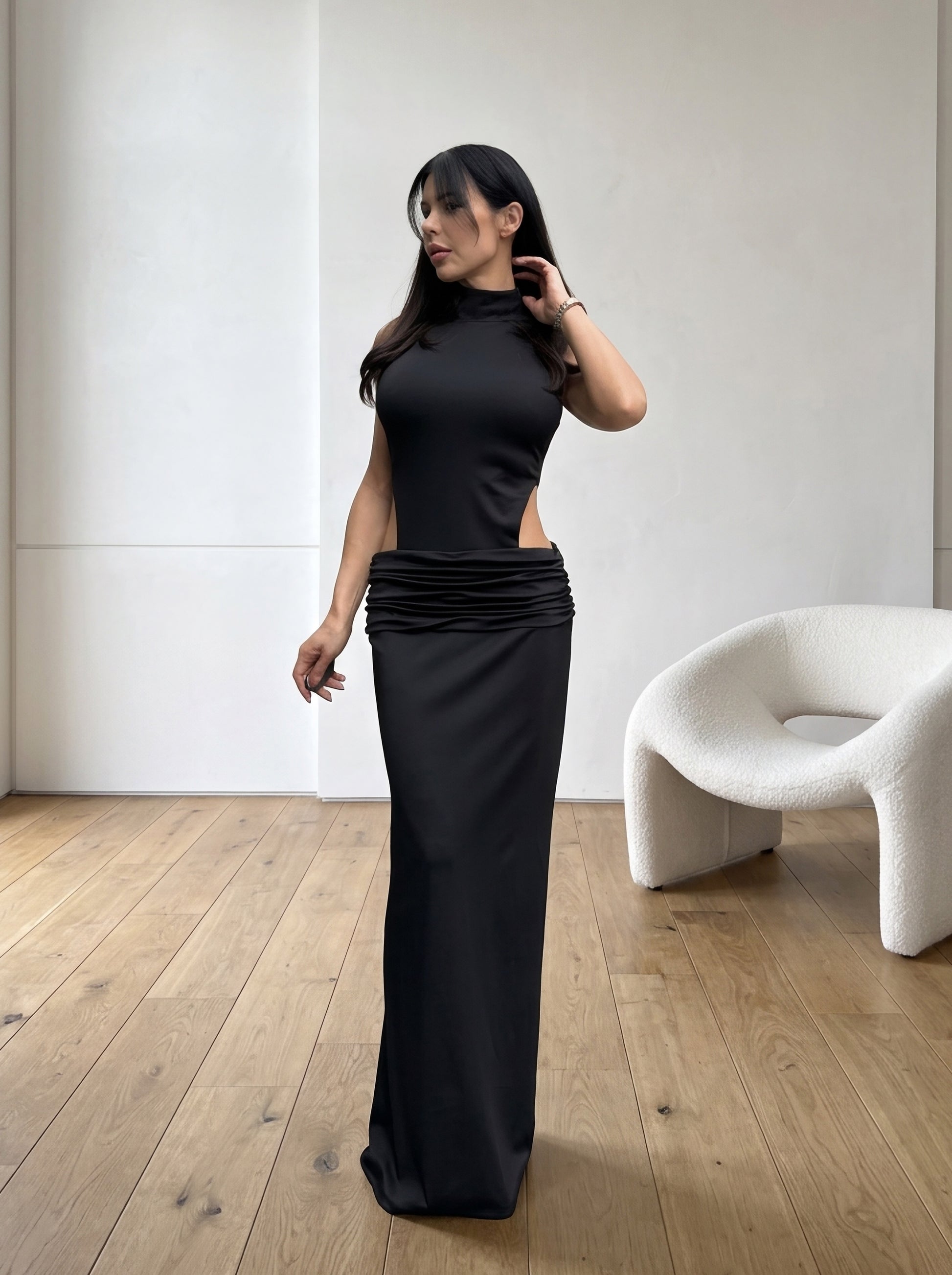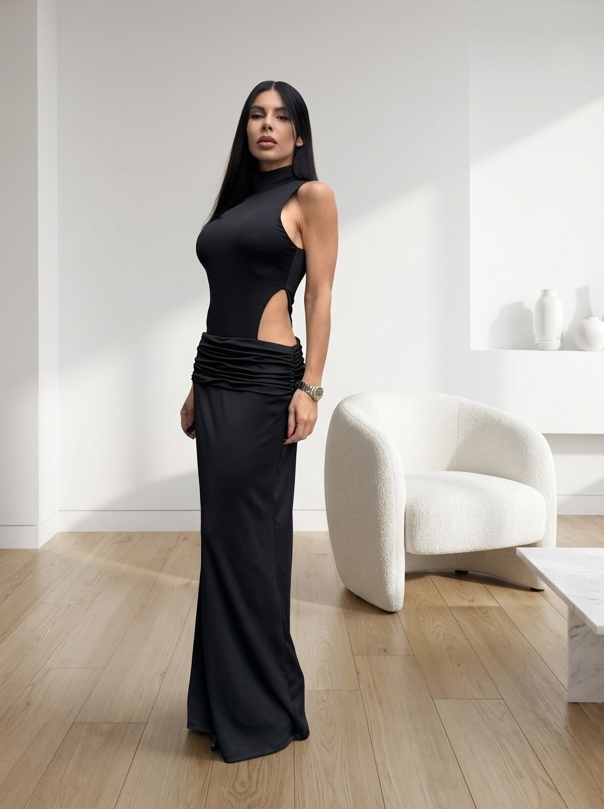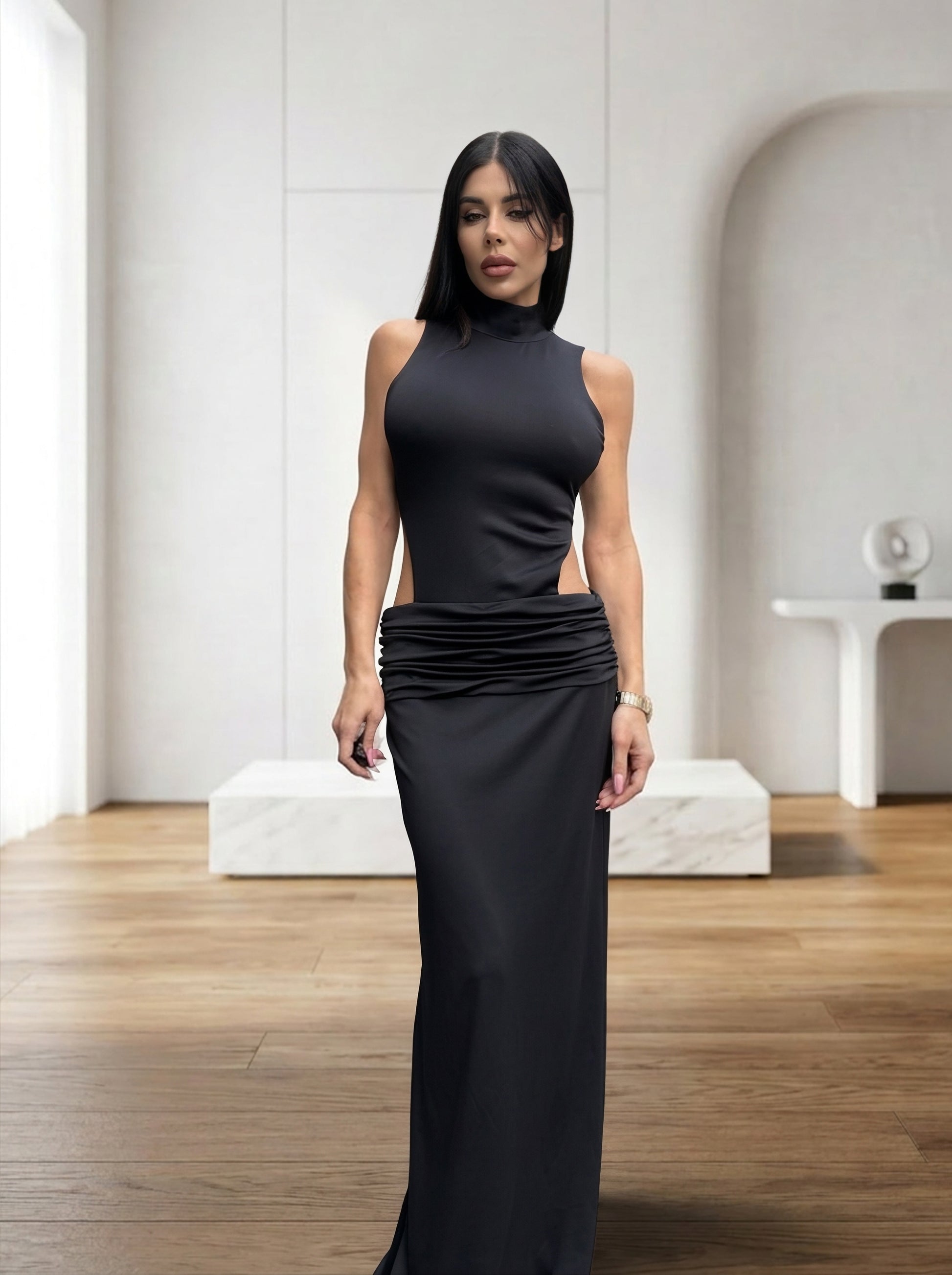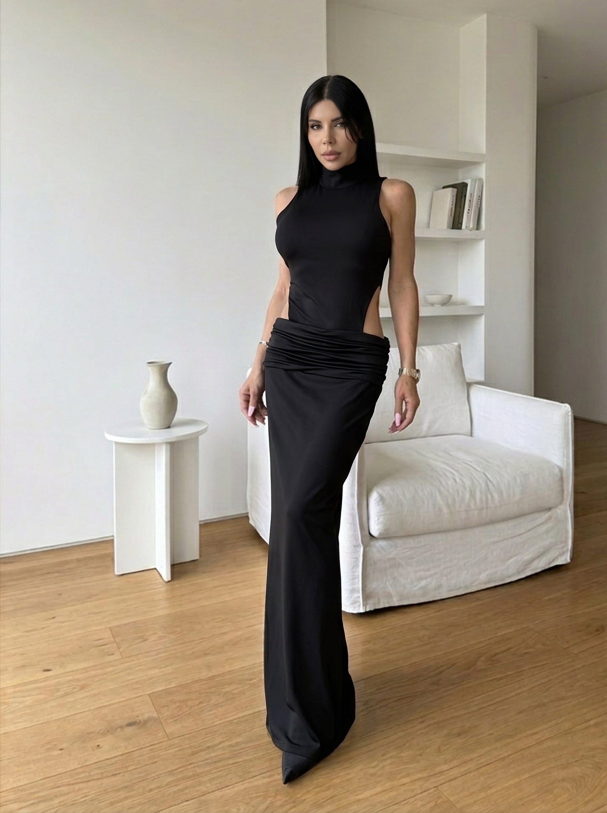 Тази впечатляваща рокля съчетава минималистична естетика с модерна женственост. Изработена от висококачествена еластична материя, тя приляга по тялото и подчертава силуета с лекота и комфорт. Дизайнът с висока яка и странични изрязвания създава балансирана визия между изисканост и съвременен стил.